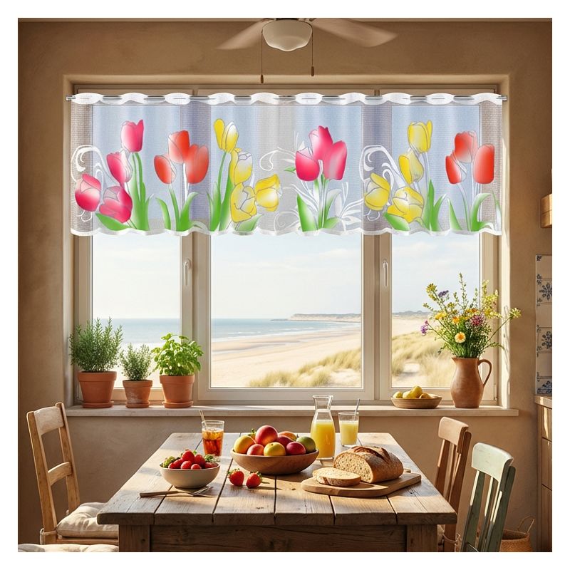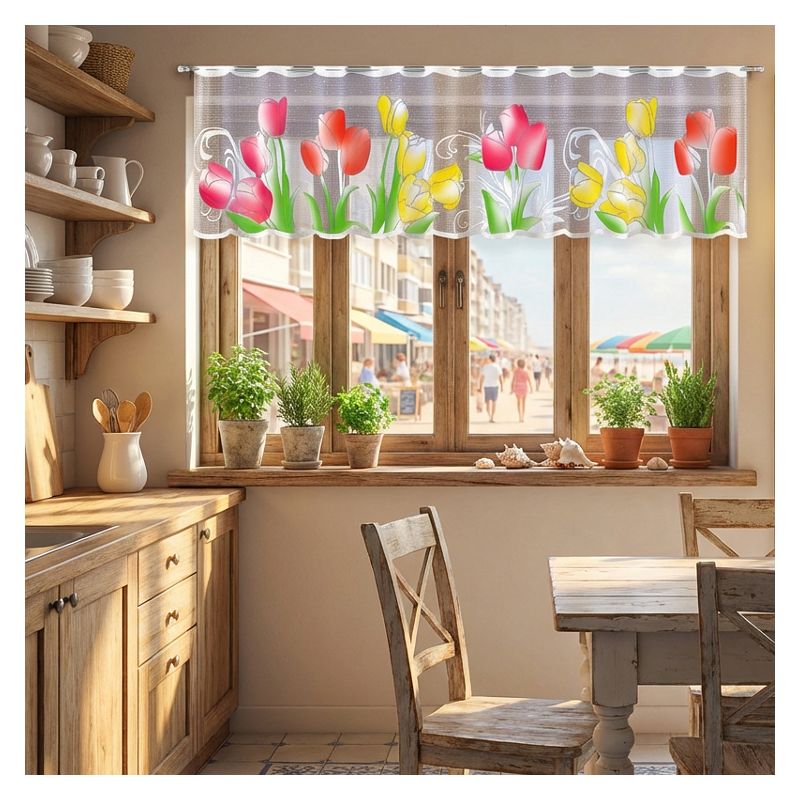 Metrażowa firana Tulipany o wysokości 50 cm to elegancka ozdoba okienna, która doda estetycznego uroku i kwiatowej świeżości wnętrzu każdej kuchni lub jadalni.