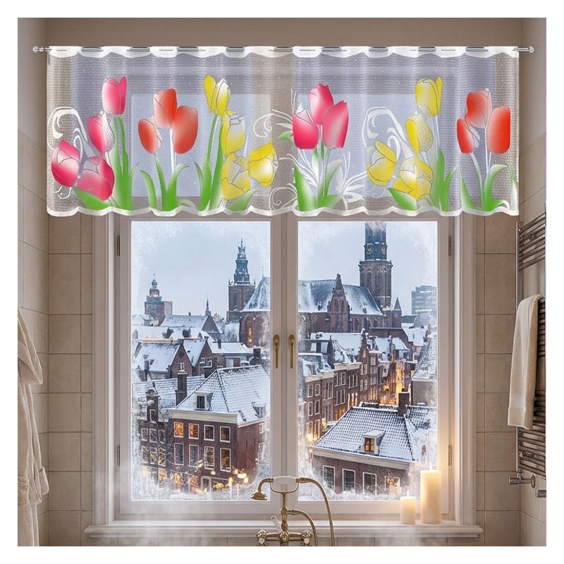 Okienna dekoracja wykonana jest z żakardowego materiału w klasycznej białej kolorystyce i ozdobiona pięknym wzorem kolorowych tulipanów. Malowane kwiaty nadają jej atrakcyjnego wyglądu i romantycznej delikatności.