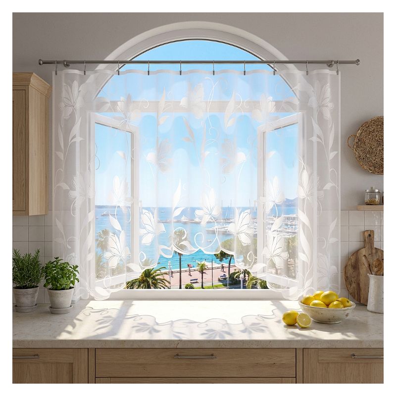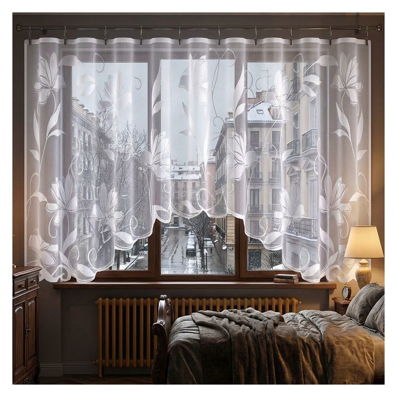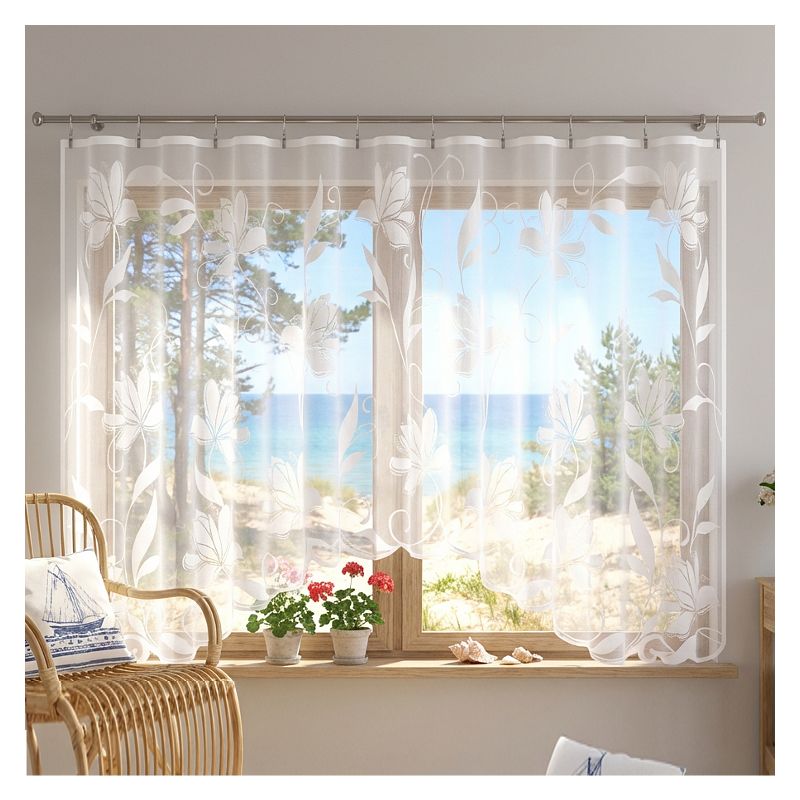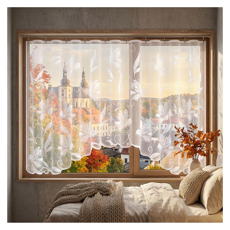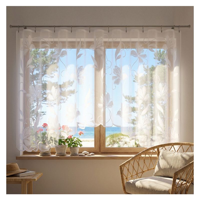 Kwiatowa firanka Vira to atrakcyjna dekoracja do ozdoby okien w Twoim salonie, pokoju dziennym i gościnnym, sypialni, jadalni, kuchni oraz łazience.