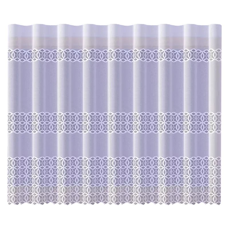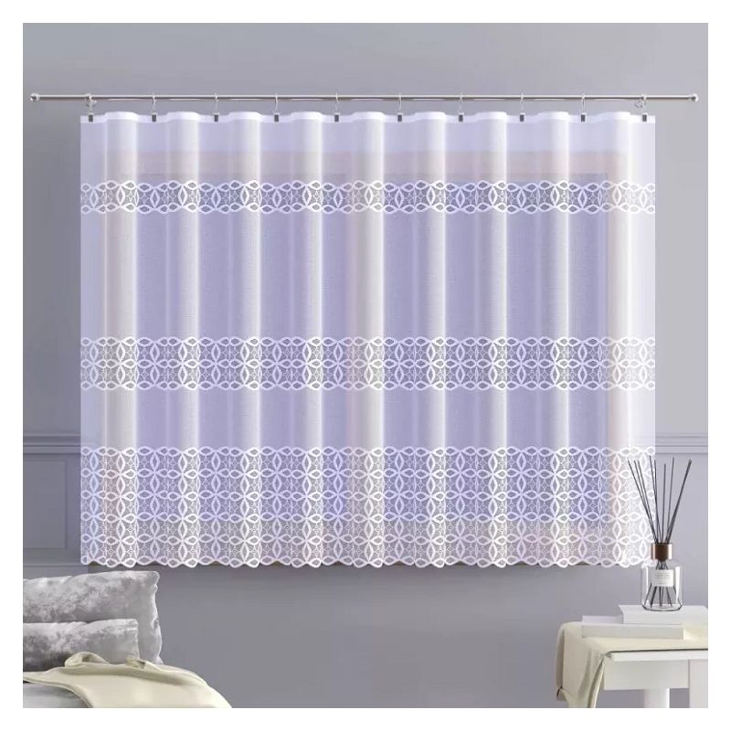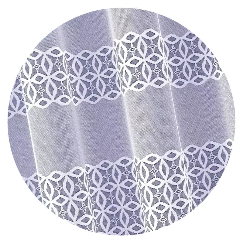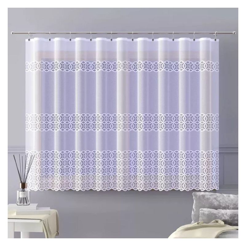Metrażowa firanka przyciąga uwagę swoim atrakcyjnym, nowoczesnym motywem zdobniczym.