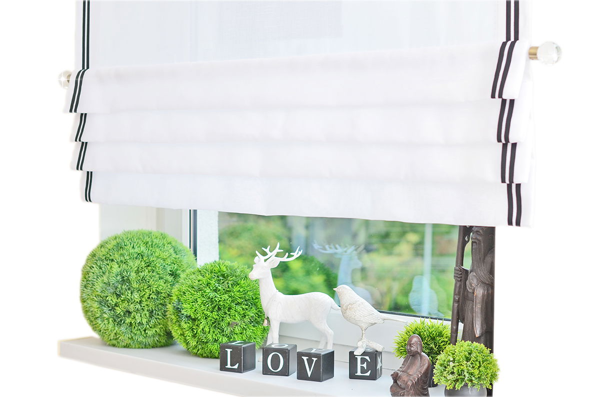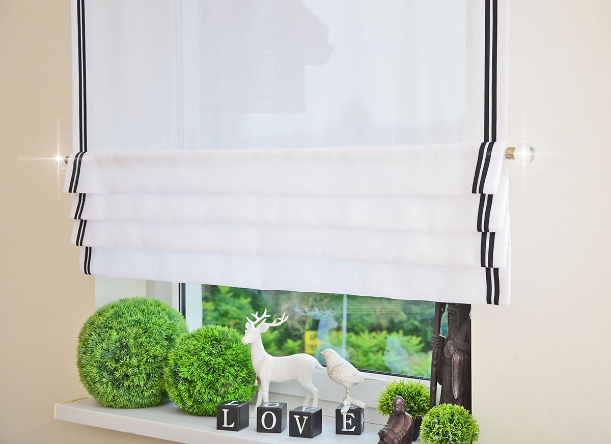 Roleta w stylu nowoczesnym ozdobiona paseczkami. Dzięki swojej minimalistycznej formie wpasuje się w każde wnętrze, doda stylu i oryginalności. Koszt podany za roletę szer 80cm dł 130cm, możemy uszyć na inne wymiary. Roleta nie wymaga usztywnienia, karnisz widoczny na zdjęciach możemy zrobić za dodatkową dopłatą. Roletę możemy uszyć białą lub ecru, ozdobne paseczki dostępne: czarne, brązowe, szare, żółte, czerwone, niebieskie, zielone