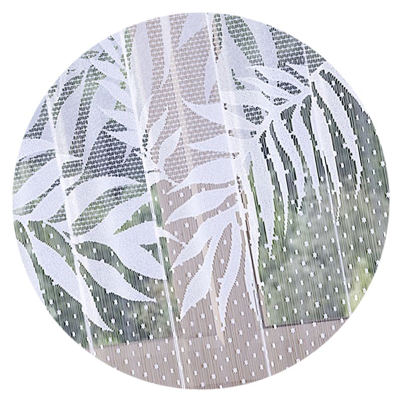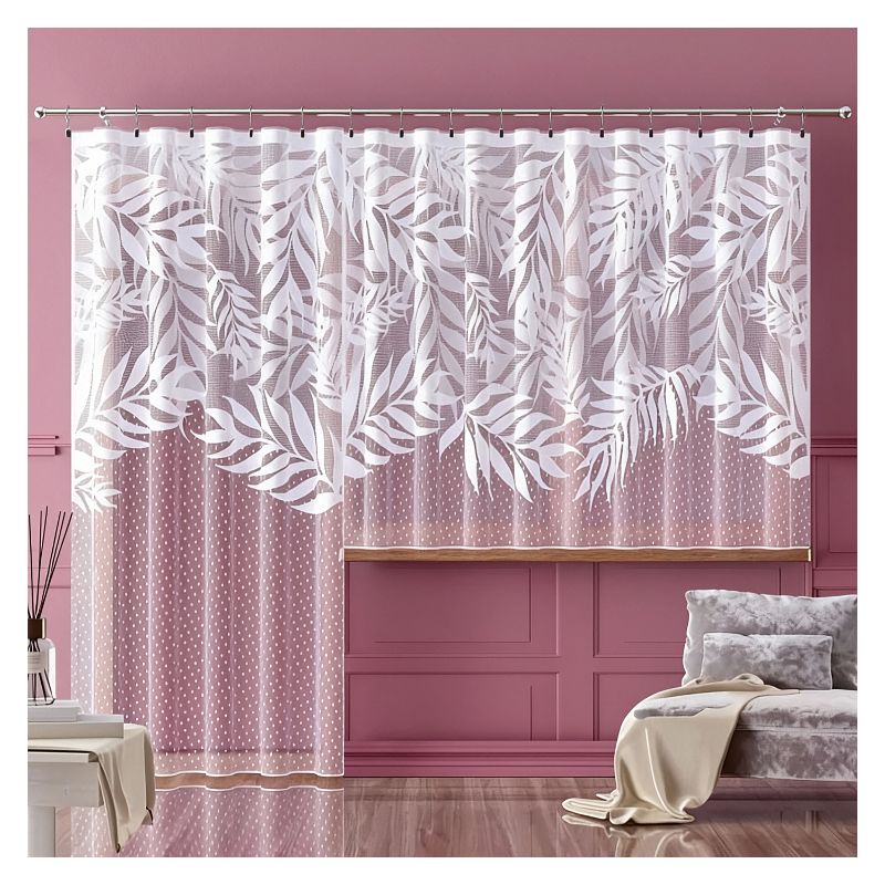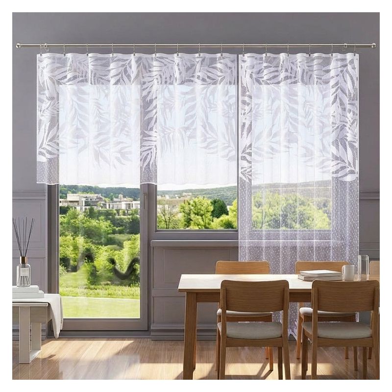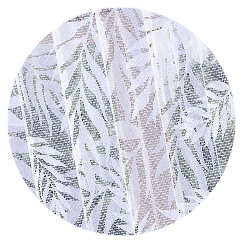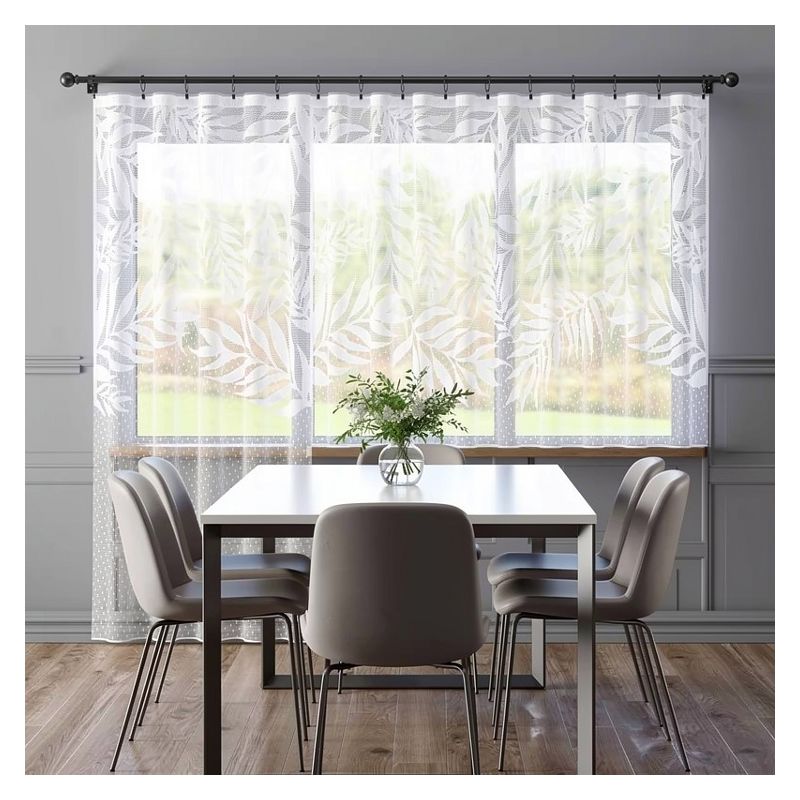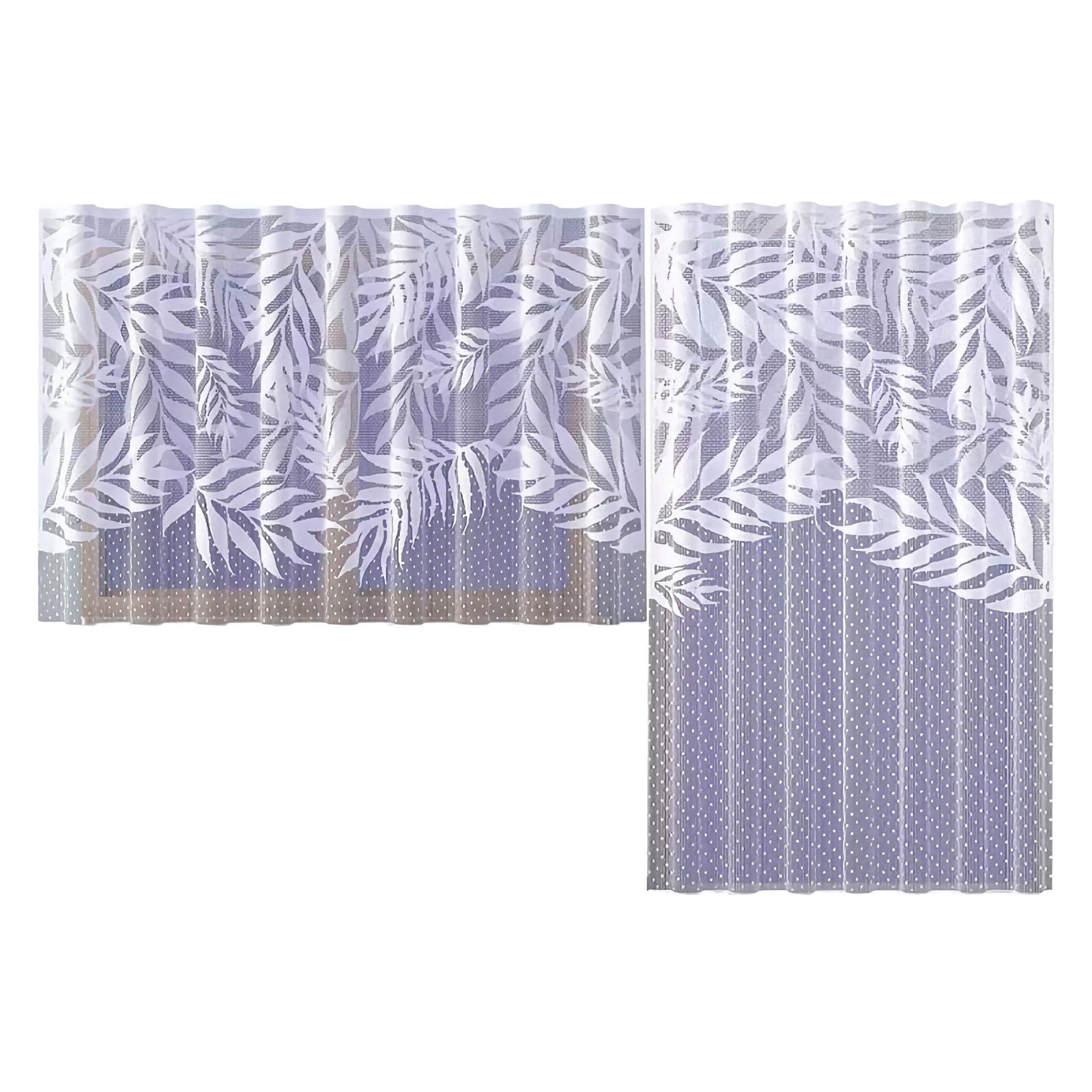 Żakardowe firanki z balkonowego zestawu ozdobione są modnym, inspirowanym naturą wzorem dużych liści.