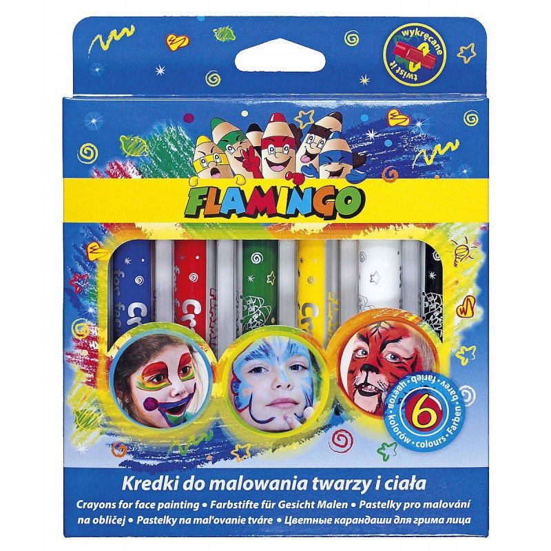 - Zestaw 6 wykręcanych kredek przeznaczonych do makijażu twarzy i ciała. Łatwe w użyciu i przechowywaniu- bezpieczne - nie podrażniają skóry- nie rozmazują się.- usuwalne za pomocą kosmetyków do demakijażu- plastikowa obudowa chroni dłonie przed zabrudzeniem i umożliwia zachowanie czystości w miejscu pracy- praktyczny klips pozwala na wpięcie kredki w dogodnym miejscu- produkt idealny także do charakteryzacji osób dorosłych: animatorów zabawy i czasu wolnego, klaunów, mimów, kibiców, itp.