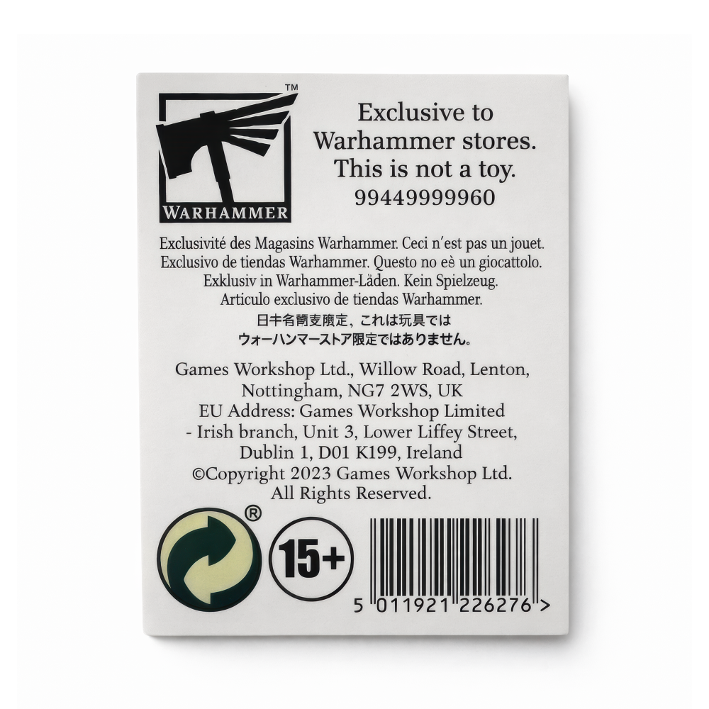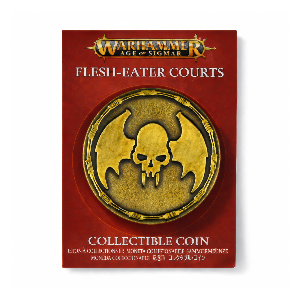 Z przeklętych sal Flesh-Eater Courts — gdzie urojenia robią z ghuli „szlachtę”, a każda uczta to obłędny bankiet — ta moneta Flesh-Eater Courts przenosi mroczny klimat Mortal Realms prosto do Twojej kolekcji. Ma 32 mm, więc jest poręczna, a przy tym daje satysfakcjonujące, „konkretne” wrażenie Metalowego żetonu: na półkę, na biurko, do torby z armią albo po prostu do kieszeni jako dyskretny akcent warhammerowego klimatu. Motyw jest bezczelnie mocny: czaszka z kłami i rozpostarte, nietoperzowe skrzydła, wszystko w wyraźnym, wypukłym reliefie na ciemniejszym, drobno fakturowanym tle. Antyczne złoto/mosiądz ładnie gra z głębokimi zagłębieniami, a segmentowana obwódka z powtarzalnymi „runicznymi” znakami wygląda jak prawdziwy artefakt, nie płaski nadruk. To estetyka, która kojarzy się z klasyczną heraldyką z battletome’ów — ostra, czytelna i natychmiast rozpoznawalna. Moneta jest na czerwonej karcie Warhammer Age of Sigmar „Flesh-Eater Courts” z logo Warhammera, a z tyłu widnieje Games Workshop Ltd., ©Copyright 2023 oraz informacja o ekskluzywności dla sklepów Warhammer. Dorzuć ją do ekspozycji albo noś jako mały talizman — świetny detal do Twojej kolekcji albo klimatyczny prezent dla fana.