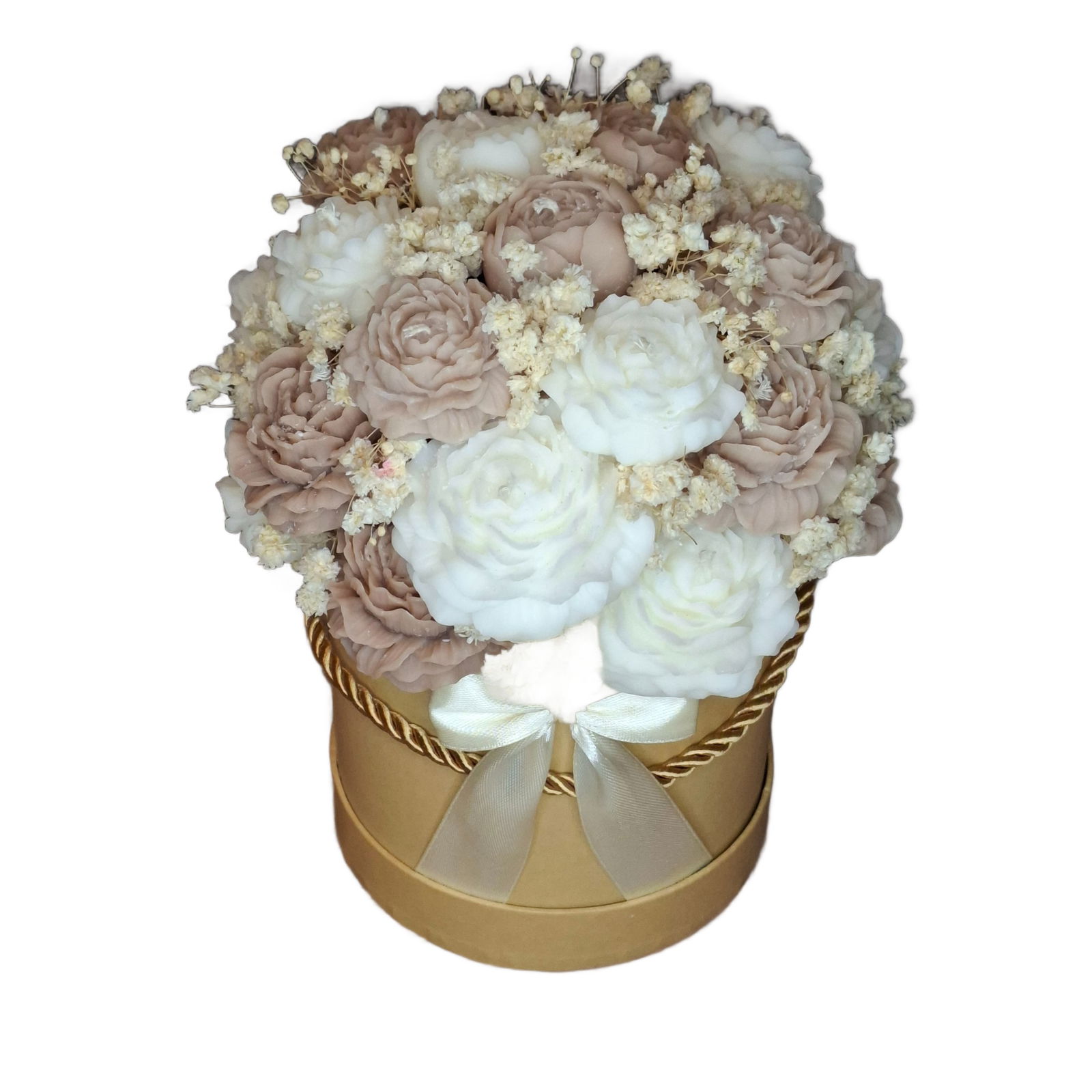 - Piękno w prostocie: Bukiet składa się z pięknie uformowanych świec sojowych w odcieniach białym i beżowym, które doskonale komponują się z każdą przestrzenią.