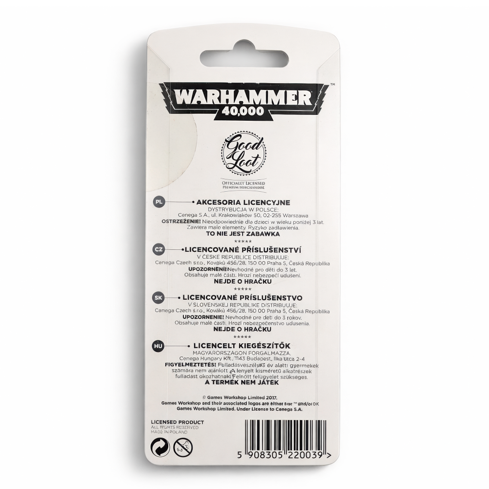 W mrocznej przyszłości 41. milenium nawet zwykłe klucze mogą nosić piętno Imperium — Flying Skull zamienia codzienny brelok w coś, co wygląda jak mała pamiątka z pola bitwy. Przy 5 cm ten metalowy brelok jest kompaktowy, ale robi wrażenie: masz solidne kółko do kluczy i krótki, „konkretny” łańcuszek w ciemnym, gunmetalowym odcieniu. Najważniejszy jest emblemat skrzydlastej czaszki w głębokiej, matowej czerni — ostre, wypukłe obramowania i wklęsłe żłobienia rozchodzą się po skrzydłach, a czaszka jest lekko cofnięta, przez co całość ma fajną, warstwową głębię. Rzeźbione linie są czytelne i wyraziste, dając surowy, grawerowany charakter pasujący do klimatu „40K”. Całość jest na firmowej blistrze Warhammer 40,000 i wyraźnie oznaczona jako oficjalnie licencjonowana przez Good Loot, więc to świetny kąsek dla kolekcjonerów kochających gotycko-industrialny vibe uniwersum. Motyw skrzydeł i czaszki przywodzi na myśl klasyczną heraldykę z kodeksów oraz wszechobecną imperialną ikonografię widywaną na pancerzach i wyposażeniu. Przypnij go do kluczy, plecaka, torby albo zestawu cosplay i niech dyskretnie pokazuje, po czyjej jesteś stronie — gotowy, by wskoczyć do Twojej kolekcji albo zostać prezentem dla innego fana.