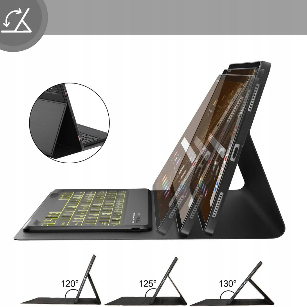 - Codziennym zużyciem.Miękkie, silikonowe wnętrze pozwala bezpiecznie umieścić tablet, a wielopozycyjna podstawka umożliwia: