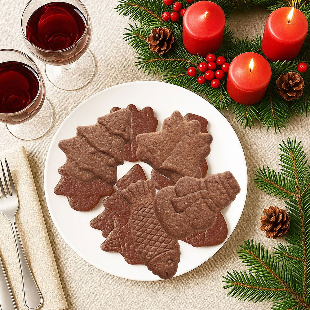 Forma do wypieku ciastek i pralin - Forma do pieczenia kruchych ciastek oraz pralin w zimowo świątecznych kształtach. Forma ma wymiary 34 x 24,5 x 1 cm. Dzięki niej przygotujemy aż 20 sztuk słodkości w pięciu różnych kształtach: małej choinki, większej choinki, bałwana, dzwonków i ryby.