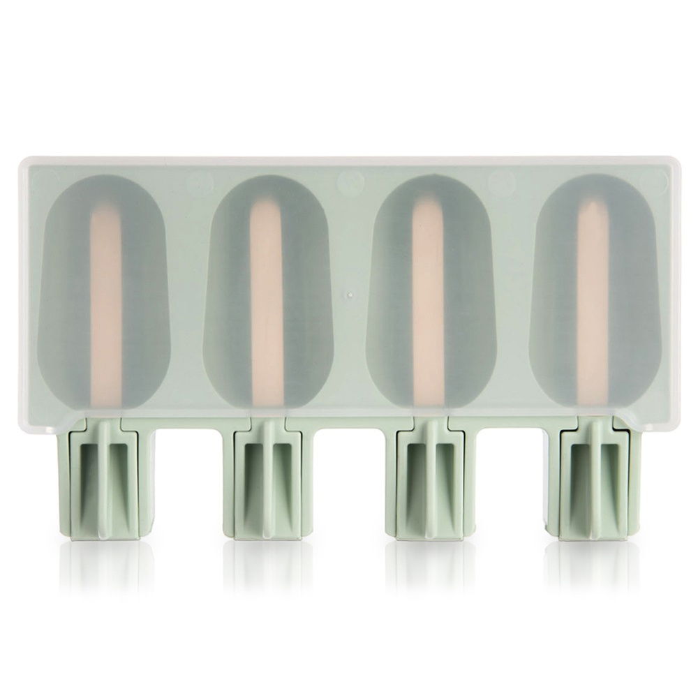 Wykonana z silikonu - Foremka wykonana z najwyższej jakości silikonu w pastelowym, zielonym kolorze. Pokrywka w przezroczystym kolorze. W zestawie 24 szt. drewnianych patyczków do lodów.
