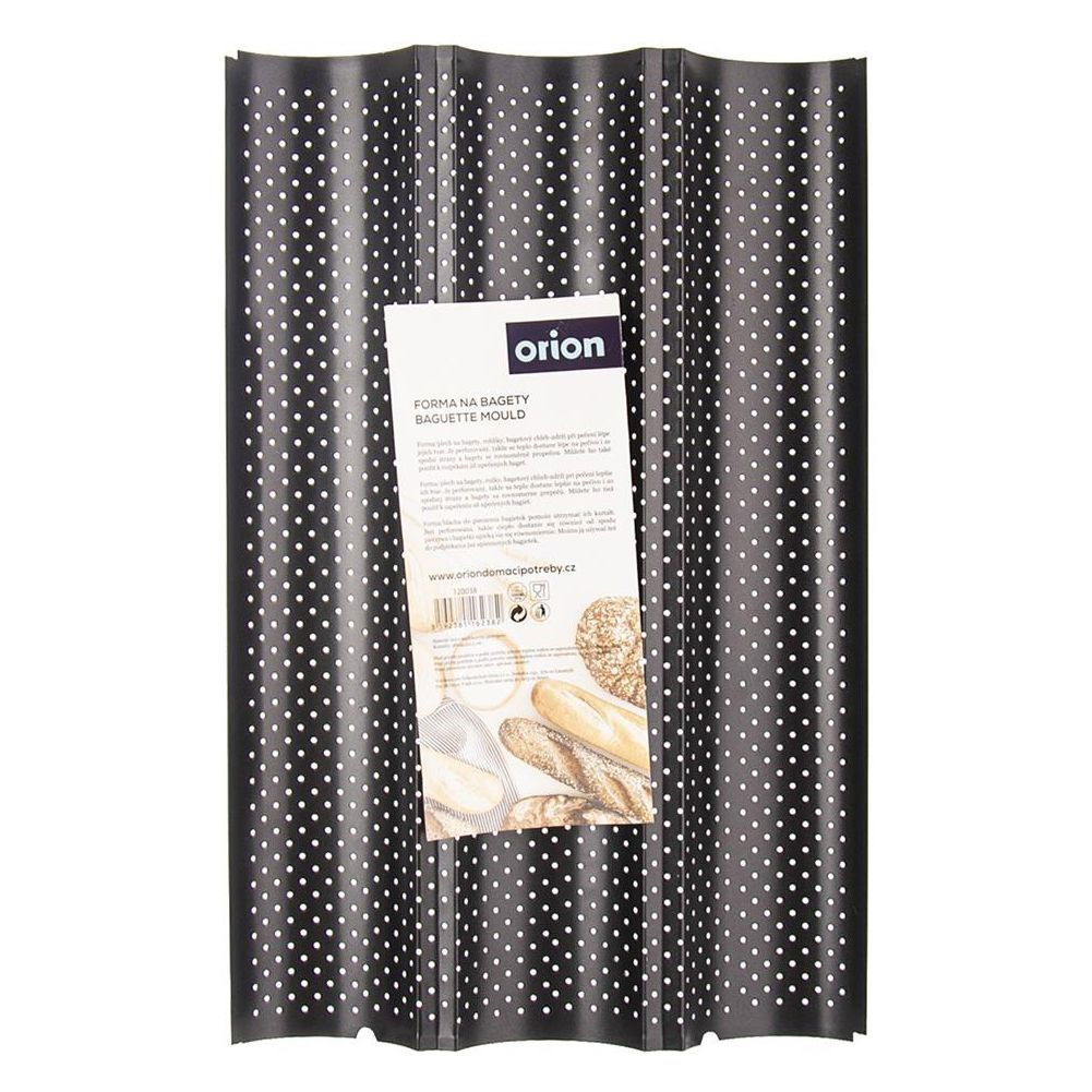 PRZYDATNA - Blacha pozwala na idealne upieczenie 3 sztuk bagietek. Forma ma wymiary 38 x 24,5 x 2,5 cm. SOLIDNA - Wykonana z najwyższej jakości stali węglowej z nieprzywierającą powłoką i perforowaną powierzchnią. Perforowana powierzchnia gwarantuje odpowiednią cyrkulację ciepła i równomierne wypieczenie bagietek. NIEPRZYWIERAJĄCA - Powłoka formy jest nieprzywierająca, dzięki czemu bagietki do niej nie przywierają i łatwo się je wyciąga. Forma jest solidna i odporna na wysokie temperatury do max 230 °C. PRAKTYCZNA - Doskonała do przygotowania pysznych i chrupiących bagietek. Sprawdzi się również przy odgrzewaniu bagietek oraz przygotowywaniu zapiekanek na bagietkach. ŁATWE UŻYTKOWANIE - Nadaje się do piekarników gazowych oraz elektrycznych. Łatwa w czyszczeniu i wygodna w użytkowaniu. Nadaje się do mycia w zmywarce do naczyń. Forma do bagietek pomoże w przygotowaniu świeżych, chrupiących bagietek w domowym piekarniku. Wykonana z wytrzymałych materiałów. Dzięki niej bagietki będą miały idealny kształt i będą równomiernie wypieczone. Należy używać wraz z rękawicami ochronnymi, w celu ochrony dłoni przed poparzeniem. Wykonana z materiałów bezpiecznych dla zdrowia i neutralnych dla żywności. Oryginalny produkt czeskiej marki Orion. Wyprodukowano zgodnie z europejskimi standardami.