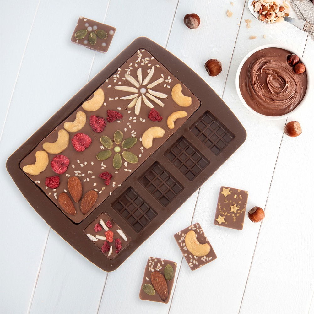 Forma do przygotowania czekolady - Praktyczna forma umożliwiająca przygotowanie pięciu mini tabliczek i jednej dużej tabliczki czekolady. Dzięki niej wykonasz domową czekoladę o ulubionym smaku, z dodatkiem orzechów, suszonych owoców czy ciasteczek. Forma ma wymiary całkowite 18,5 x 13,5 x 1,5 cm.