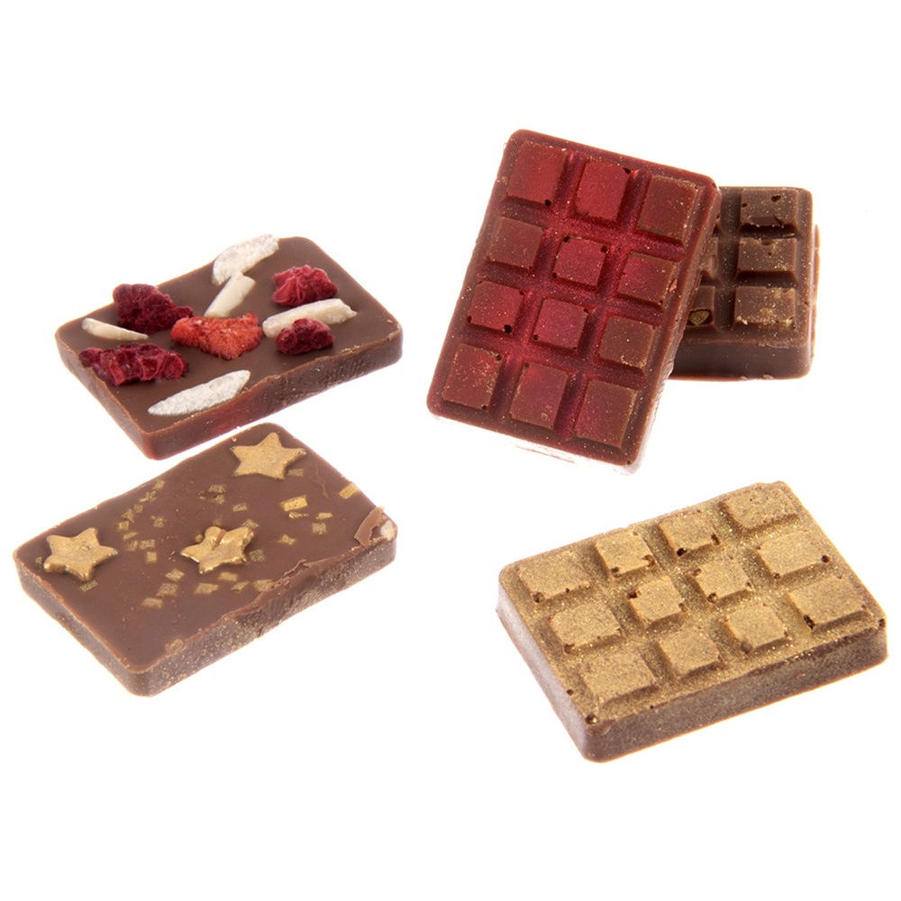 Różne rozmiary tabliczek czekolady - W formie można przygotować jedną dużą tabliczkę o wymiarach 15 x 7,5 cm oraz pięć mini tabliczek o wymiarach 3,5 x 2,5 cm. Grubość utworzonej czekolady to 0,5 cm. Pozwala to tworzyć czekolady w różnych wielkościach – zarówno do degustacji, jak i na prezent.