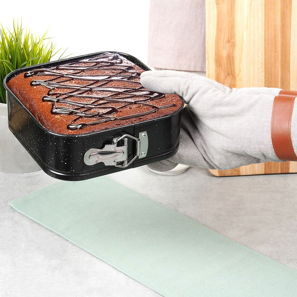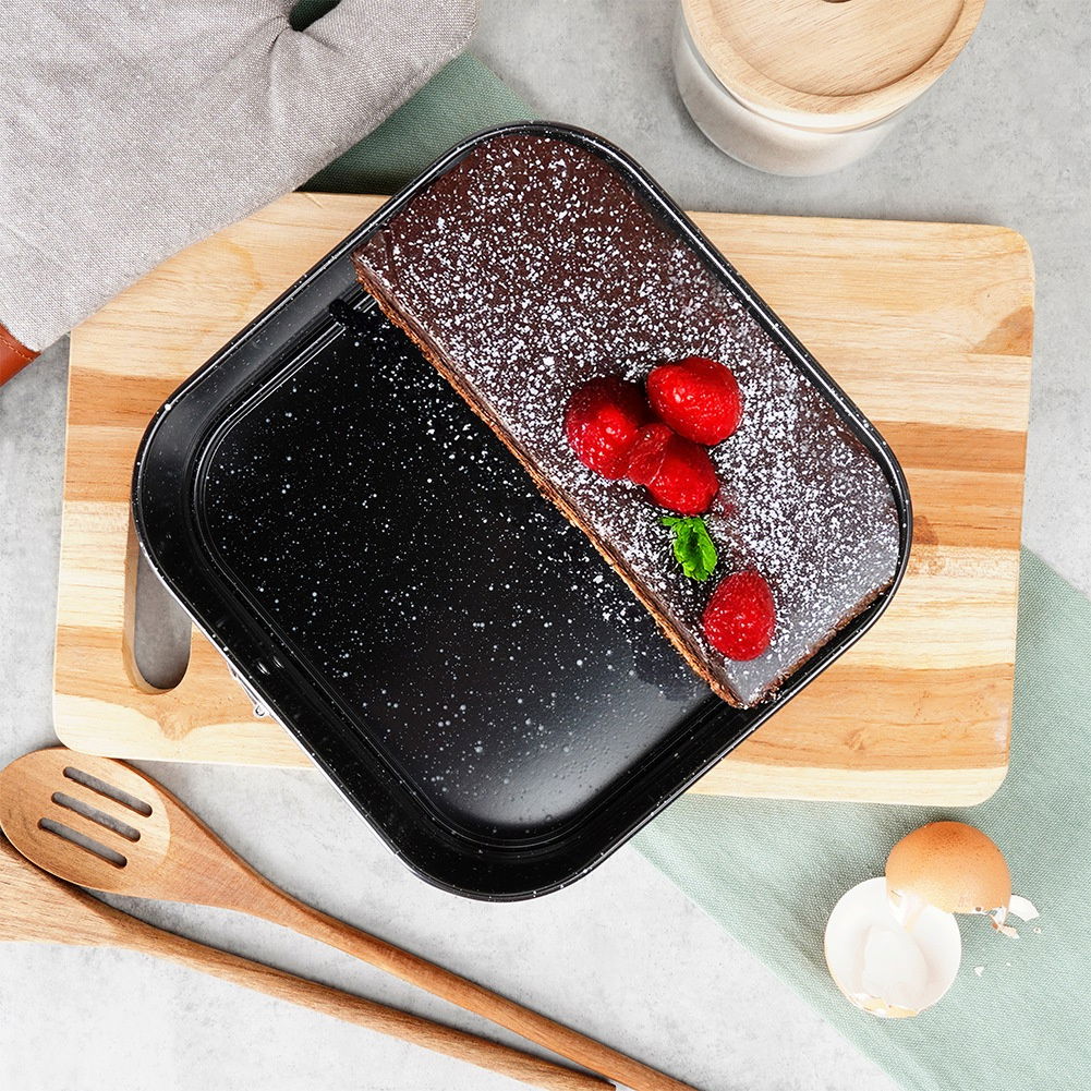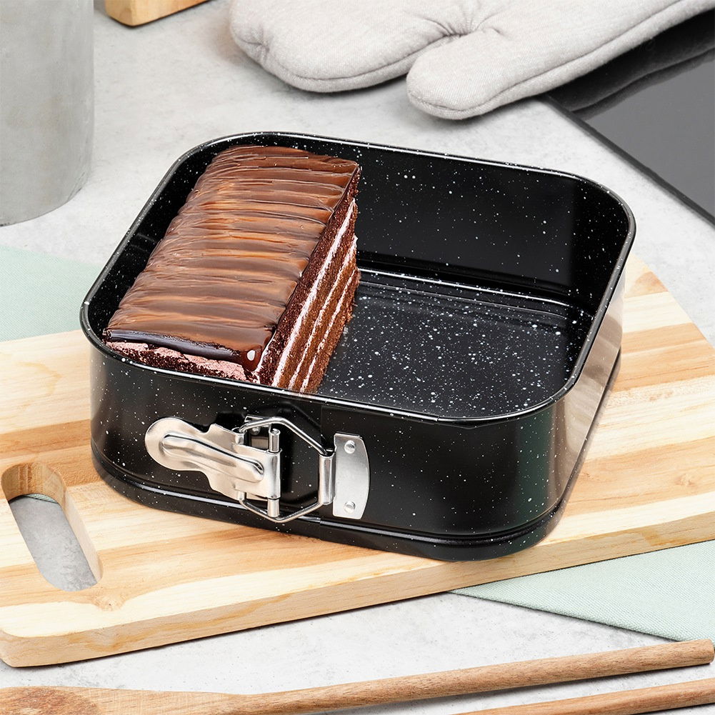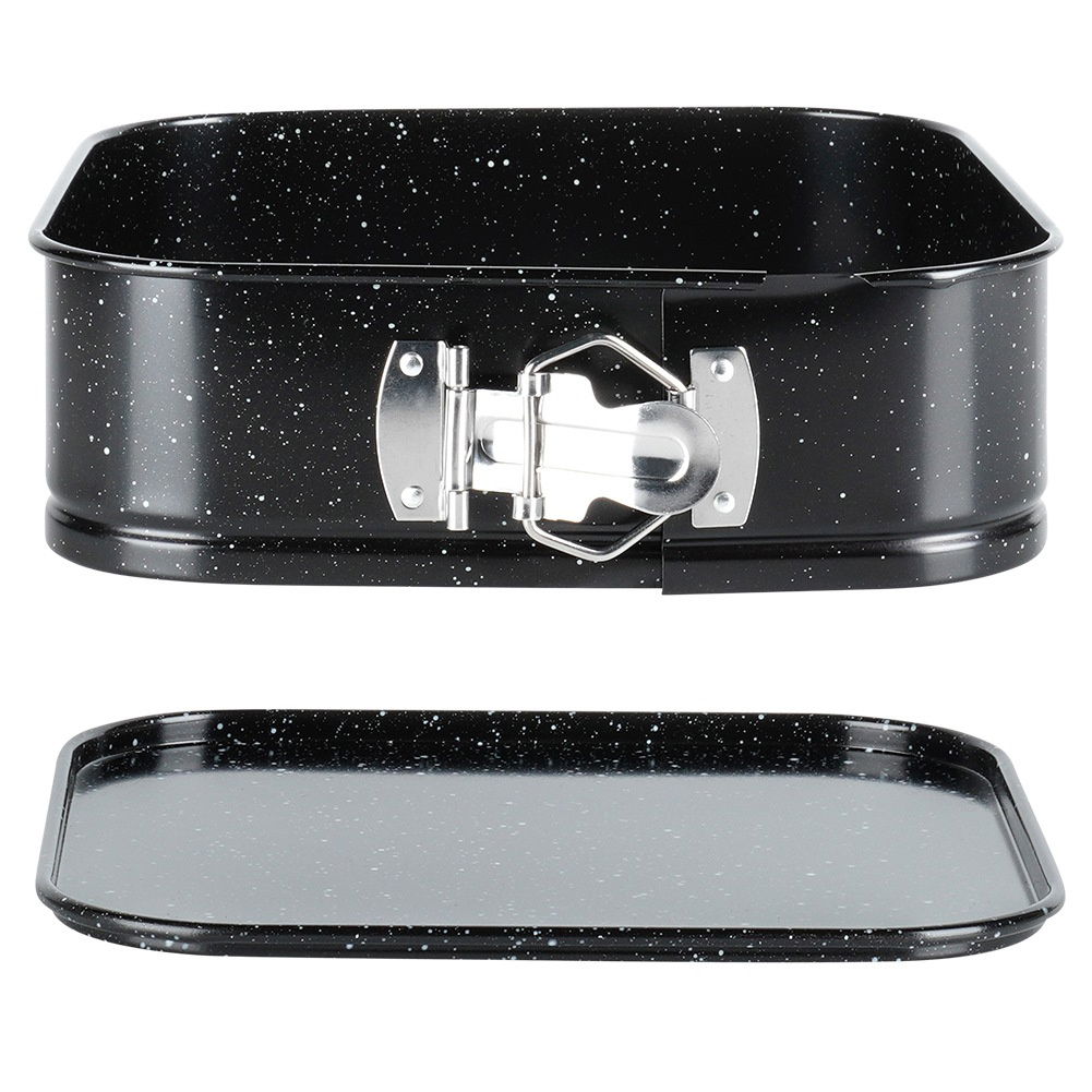 Kwadratowa forma do pieczenia ciast z granitową powłoką. Brzegi tortownicy są rozpinane. Forma nadaje się do piekarników gazowych oraz elektrycznych.