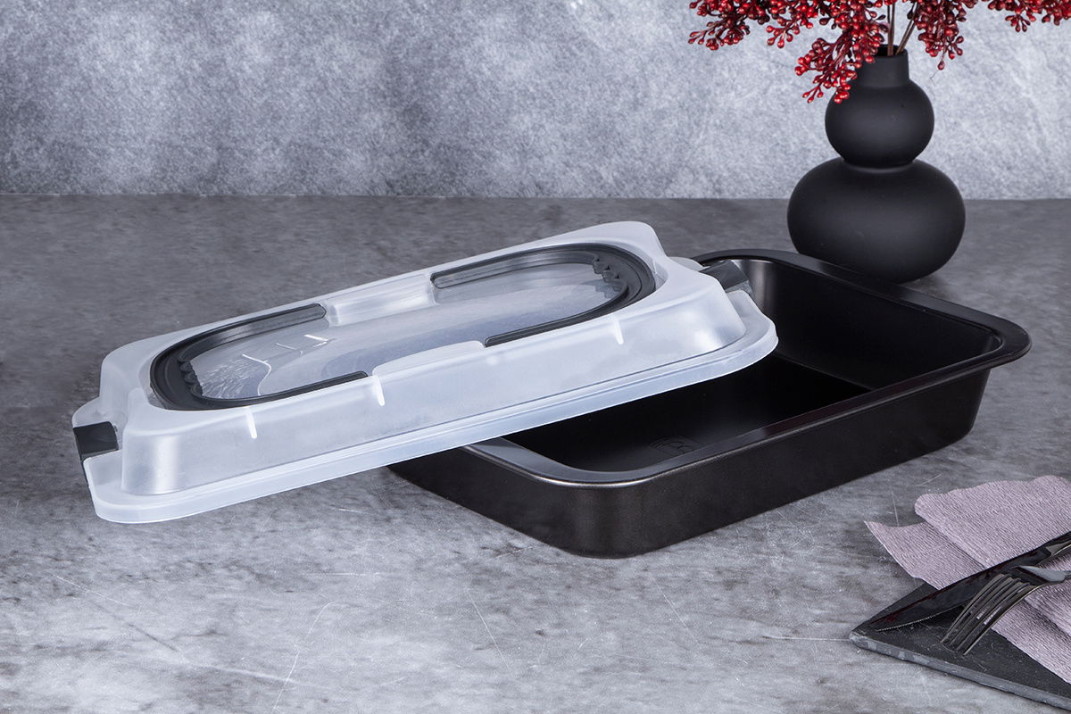 Materiał: wysokiej jakości prasowanego aluminium pokryta z zewnątrz żaroodpornym lakierem o charakterystycznym metalicznym połysku.Potrójna powłoka nieprzywierająca w kolorze czarnymMożliwość pieczenia w temperaturze do 220 stopni CWolna od związków PFOA, Kadmu i ołowiuECO FriendlyKolor: czarny opalizującyRozmiar: 36,5 x 24,5 x 5.5 cm