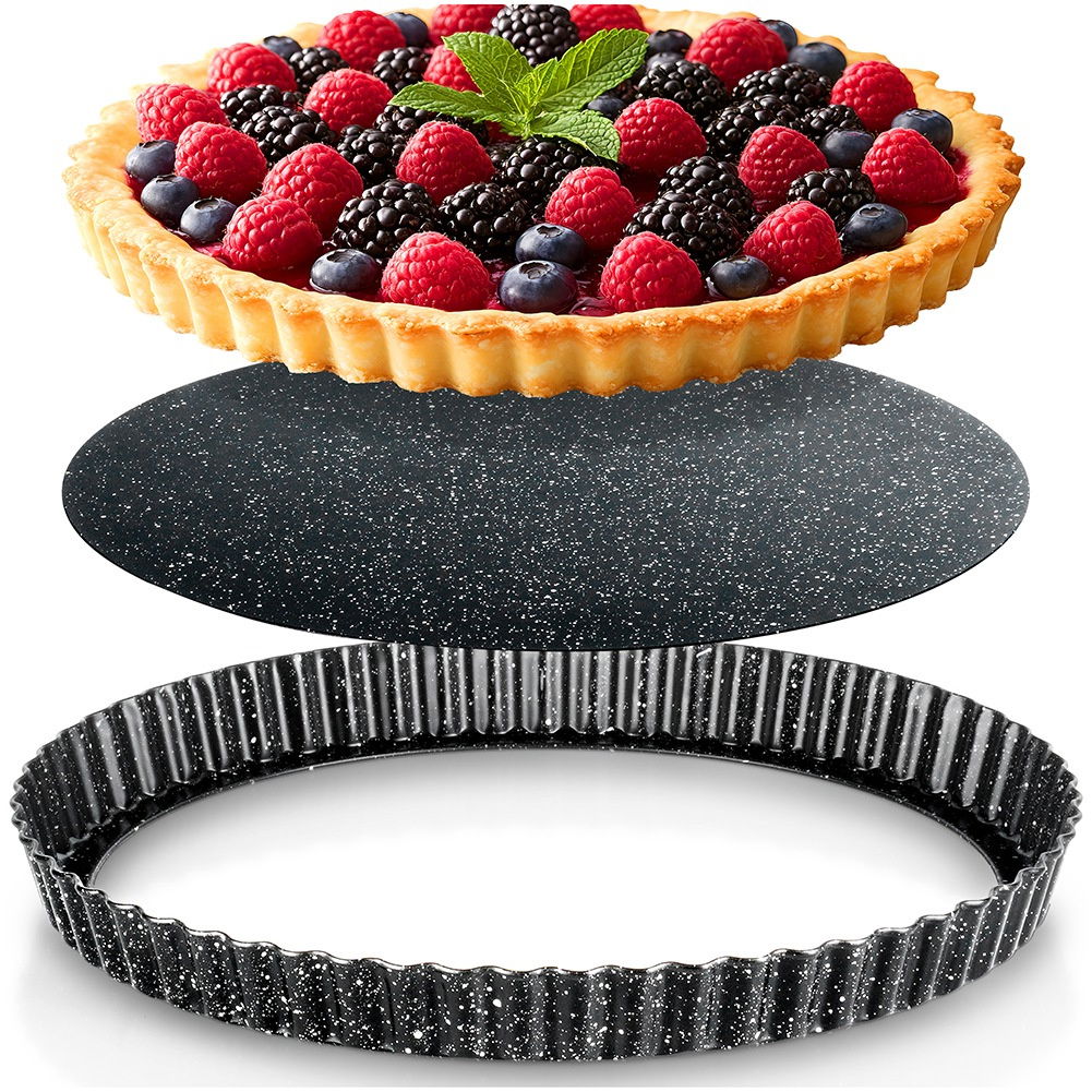 Okrągła forma do tarty o średnicy 28 cm z wyjmowanym dnem. Wykonana ze stali węglowej z powłoką granitową. Idealna do przygotowania tart wytrawnych, jak i słodkich.