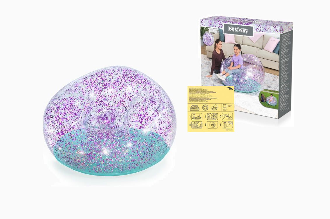 Dmuchany fotel Glitter Dream to stylowy relaks w blasku mieniącego się brokatu.