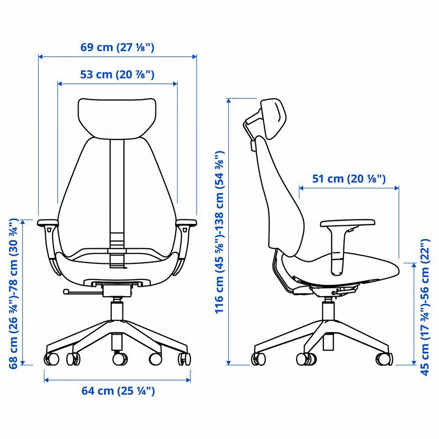 - Szerokość siedziska: 53 cm, Głębokość siedziska: 51 cm, Max. wysokość siedziska: 56 cm Min. wysokość siedziska: 45 cm