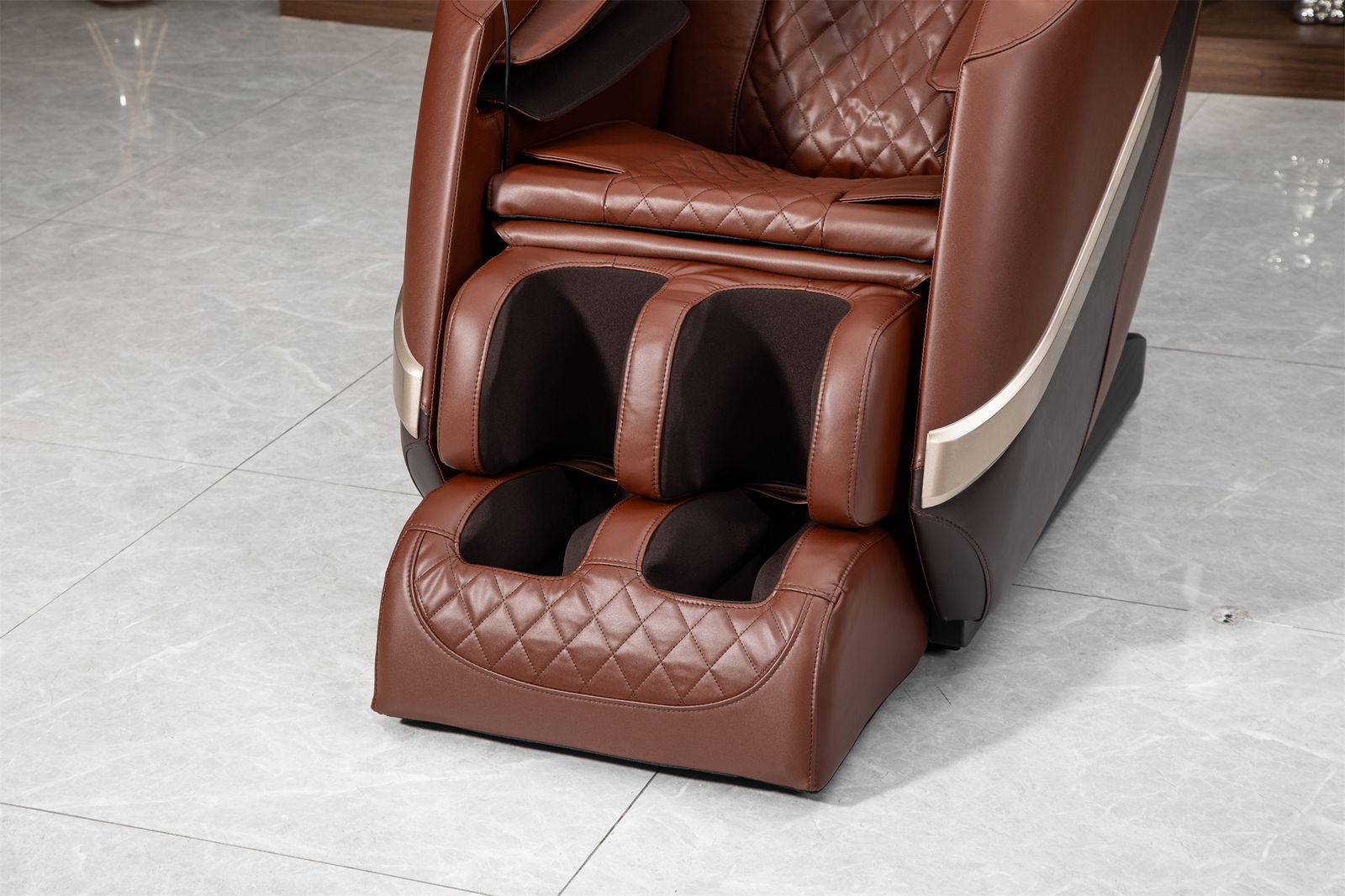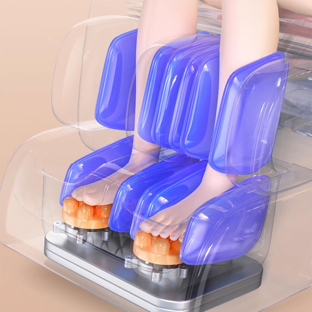 Łydki i stopy masowane za pomocą poduszek powietrznych jest to masaż uciskowy tą opcję można wyłączyć w programie manualnym. Ponadto rolowanie stóp systemem rolek Shiatsu to świetne rozwiązanie po ciężkim dniu pracy dla twoich stóp. Nasz system posiada aż 3 prędkości rolowania.