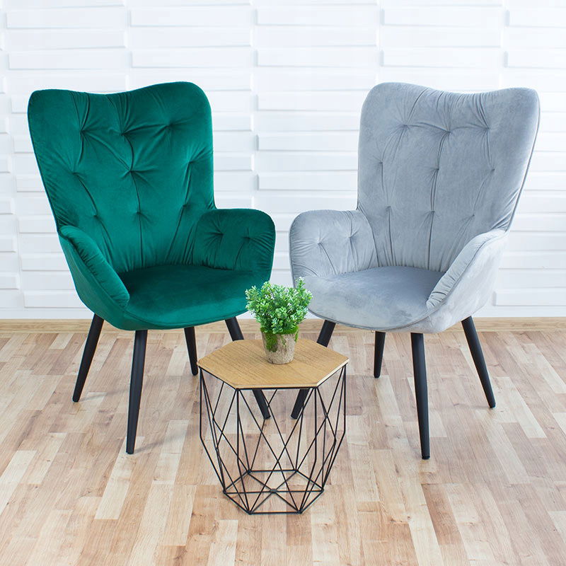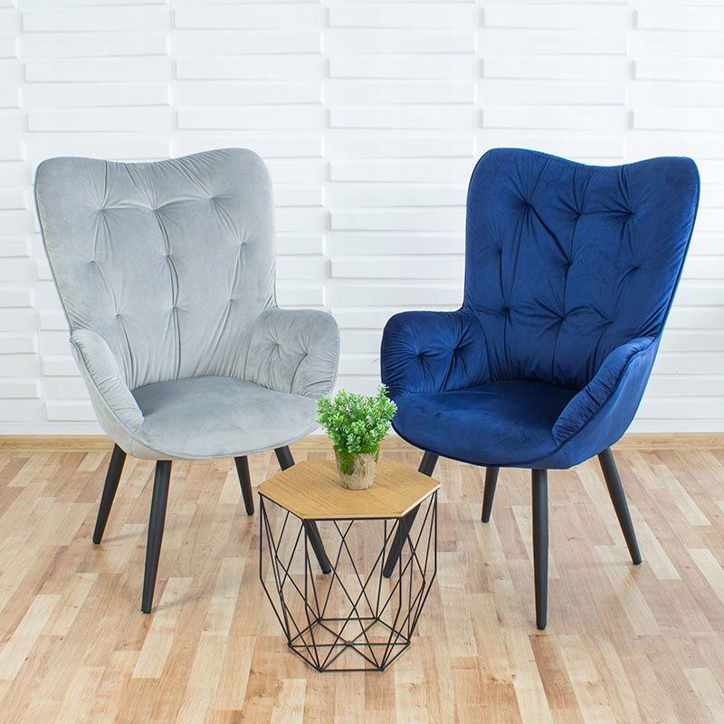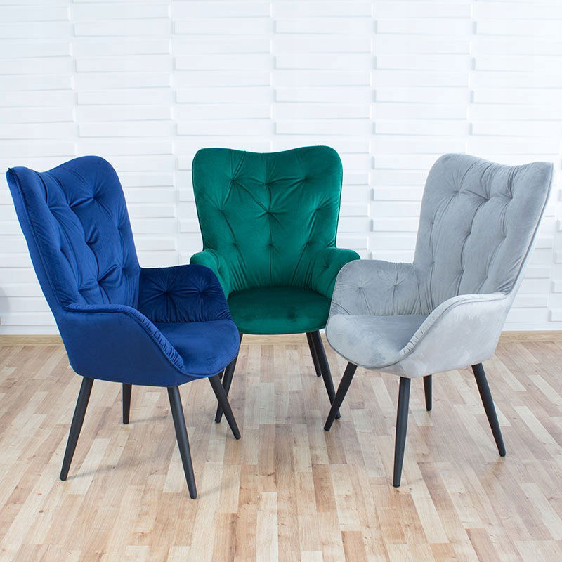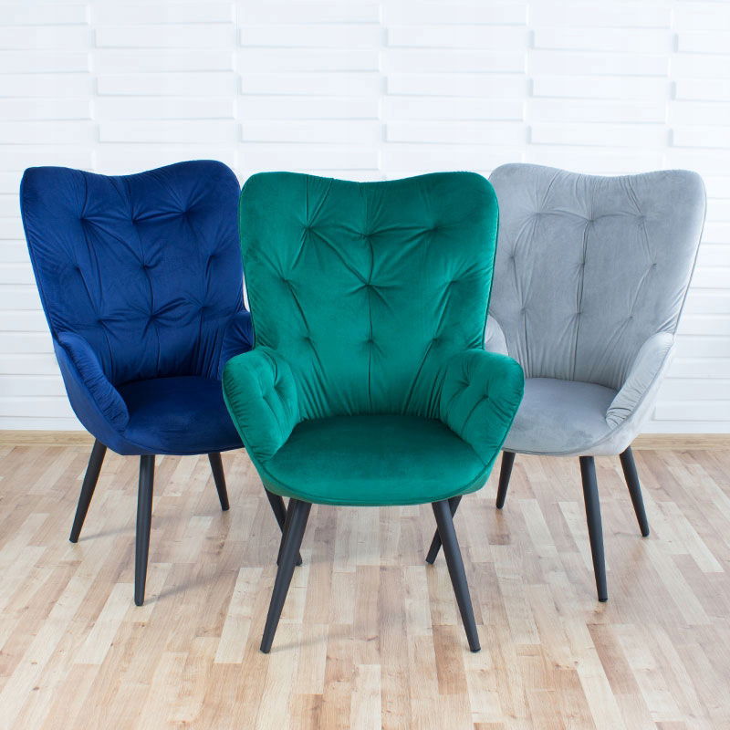 Fotel wypoczynkowy z wysokim oparciem i welurowym siedziskiem - tradycyjny fotel uszak w nowoczesnym wydaniu. Świetny wybór do salonu, sypialni czy biura.