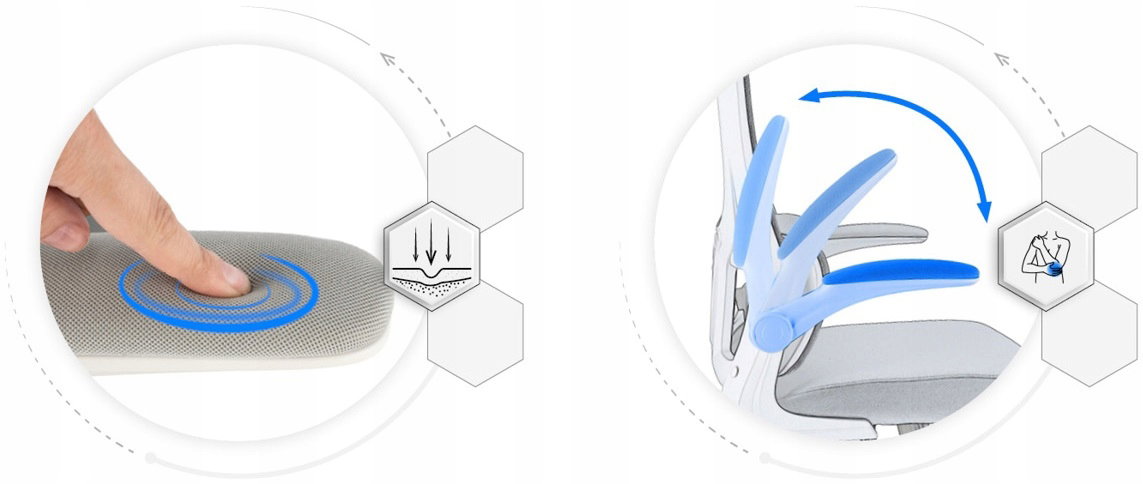 ❗️Ruchome podłokietniki, które zapewniają optymalne ustawienie ramion i łokci użytkownika - można je również odchylić maksymalnie do góry i korzystać z fotela bez podłokietników.