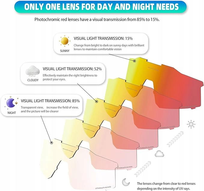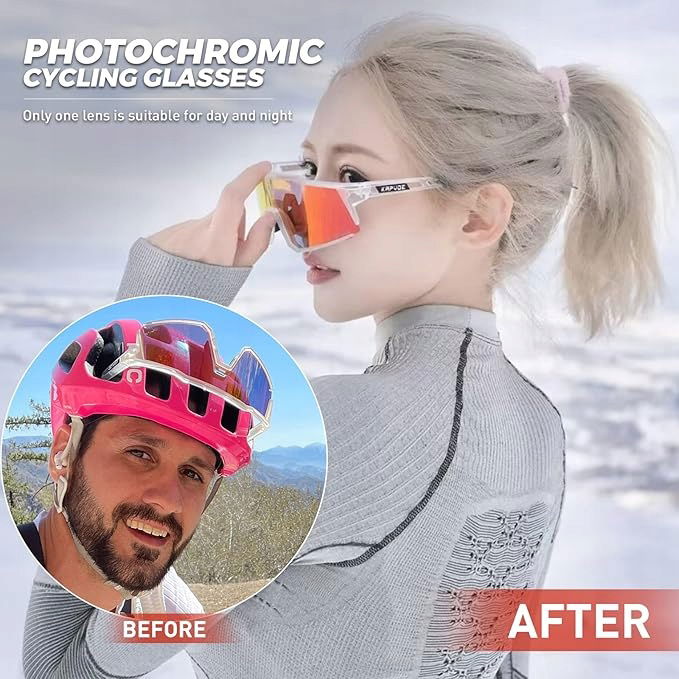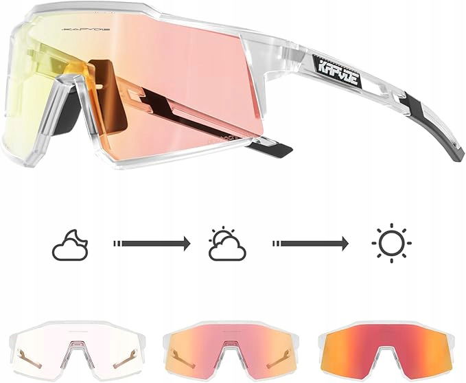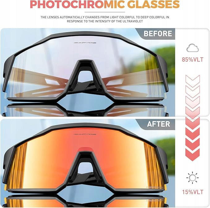 - Fotochromowe okulary rowerowe - te okulary rowerowe wykorzystują technologię fotochromową, soczewki automatycznie wyraźniej lub ciemnieją w odpowiedzi na intensywność promieniowania ultrafioletowego, zmieniają się z jasnego na ciemne w słonecznym, skutecznie utrzymują odpowiednią jasność, aby chronić oczy.