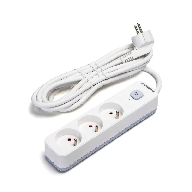Francuski przedłużacz 3-gniazdowy z wyłącznikiem biało-szary 3m