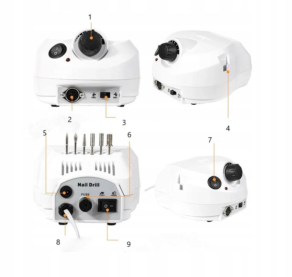 Zestaw zawiera frezarkę, głowicę, pedał nożny, zestawy frezów z kapturkami, uchwyt do montowania głowicy, plastikową podpórkę do głowicy, frez ceramiczny stożek średni oraz instrukcję obsługi. Pokrętło na stacji zasilającej umożliwia płynną regulację obrotów.