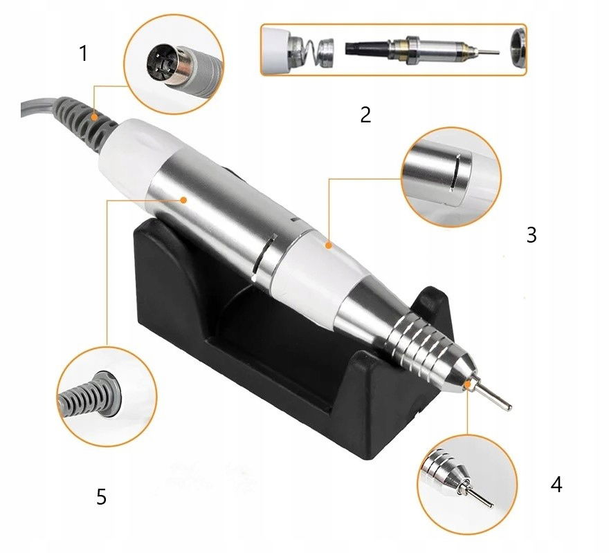 Dzięki odpowiedniej mocy frezarki możliwe jest również wygrawerowanie różnorodnych wzorów na paznokciach. Frezarka jest kompatybilna z standardowymi frezami o średnicy trzpienia 2,35 mm.