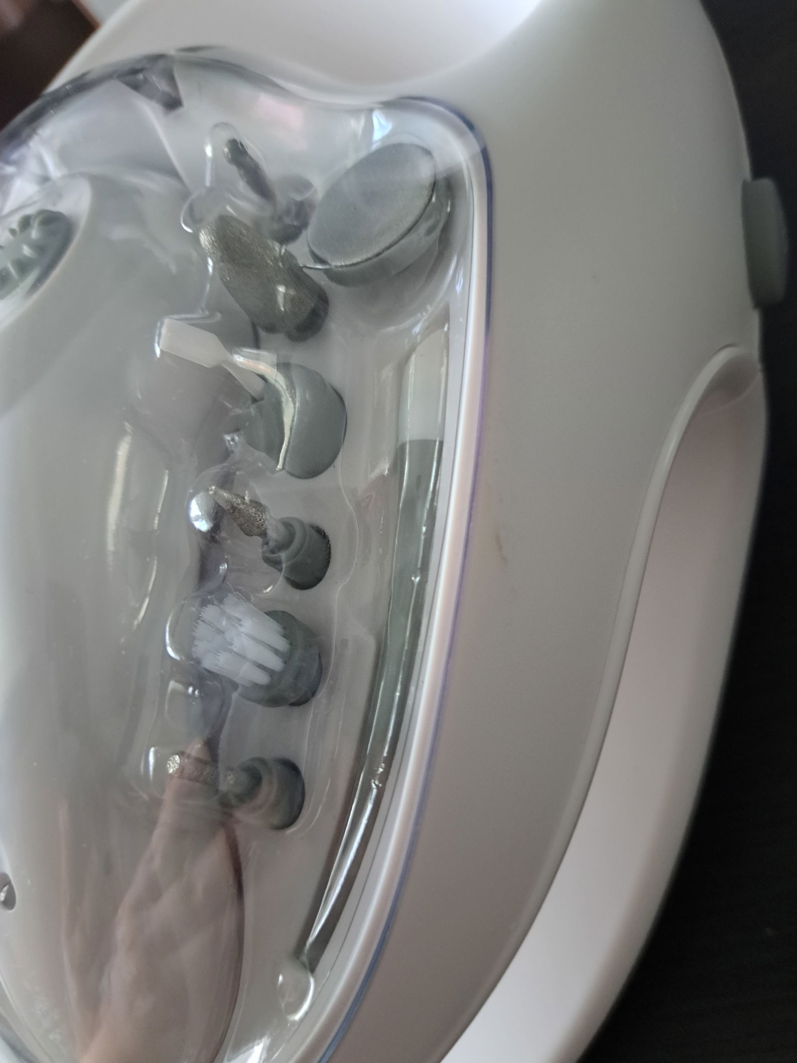 11 różnych wysokiej jakości nasadek z szafiru i filcu (nakładki: duży dysk szafirowy drobny, duży dysk szafirowy gruby, mały dysk szafirowy drobny, mały dysk szafirowy gruby, szafirowy stożek, obcinacz cylindryczny, okrągły frez szafirowy, pędzel, nasadka z cienkim szafirowym stożkiem, tarcza polerska, elektryczny odpychacz do skórek).