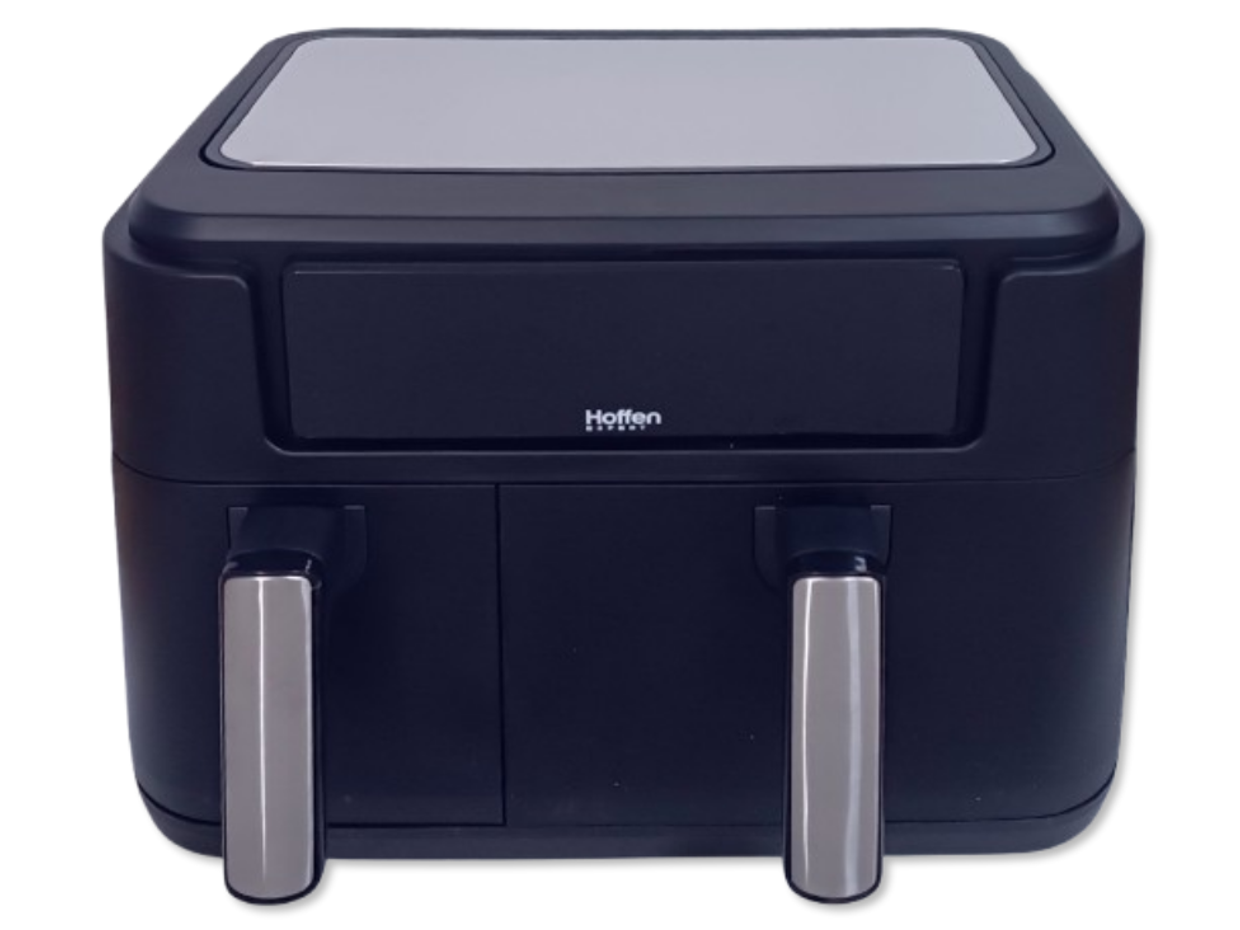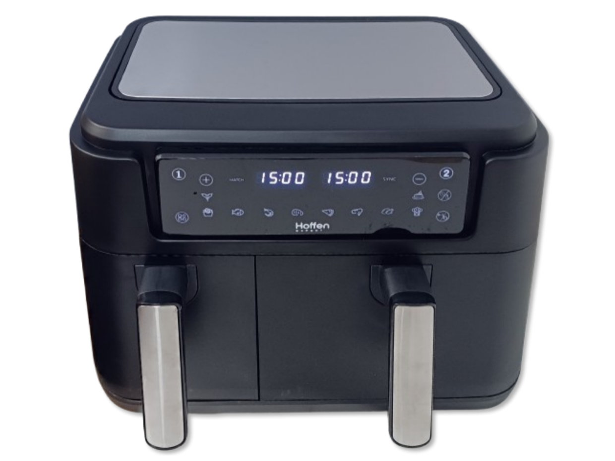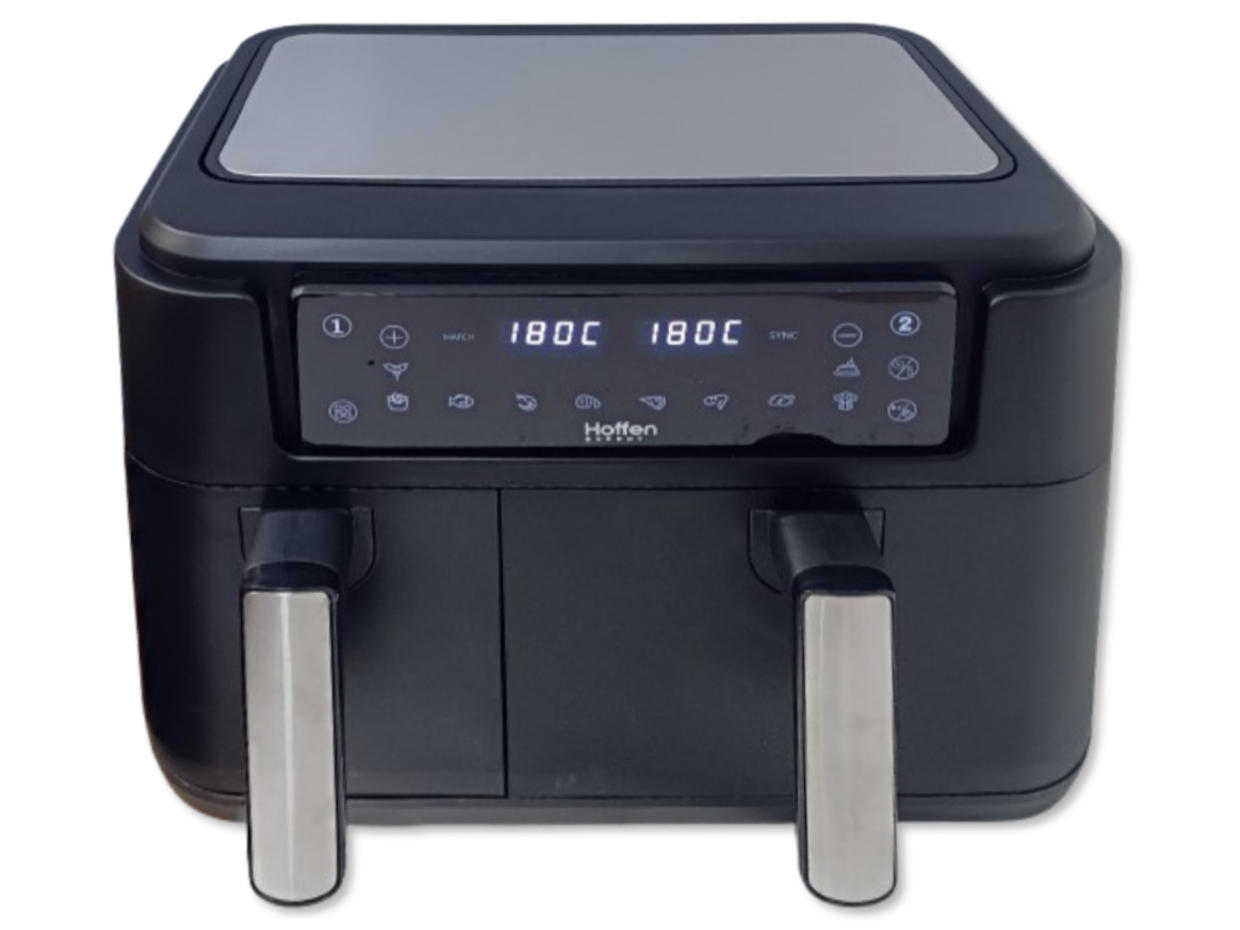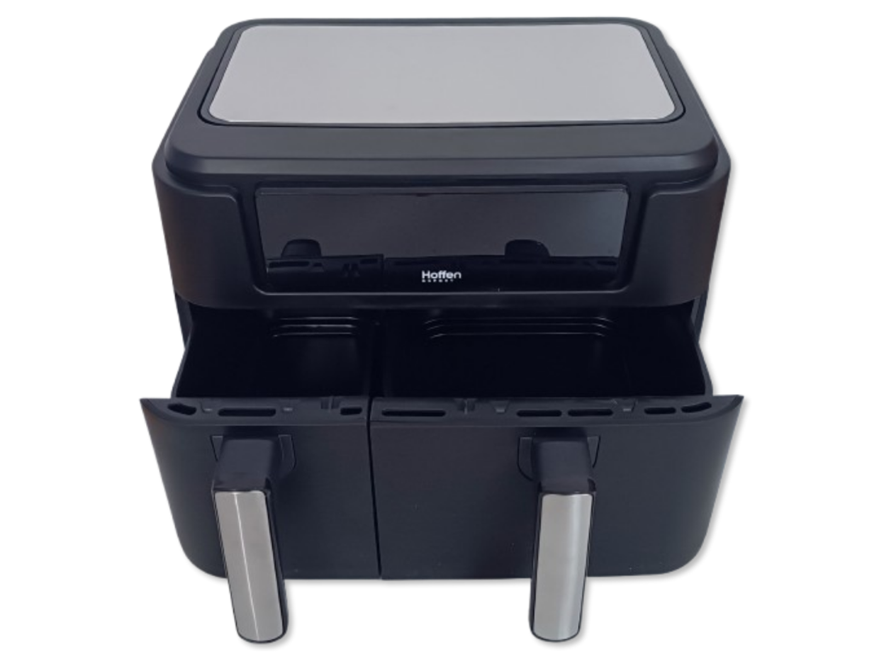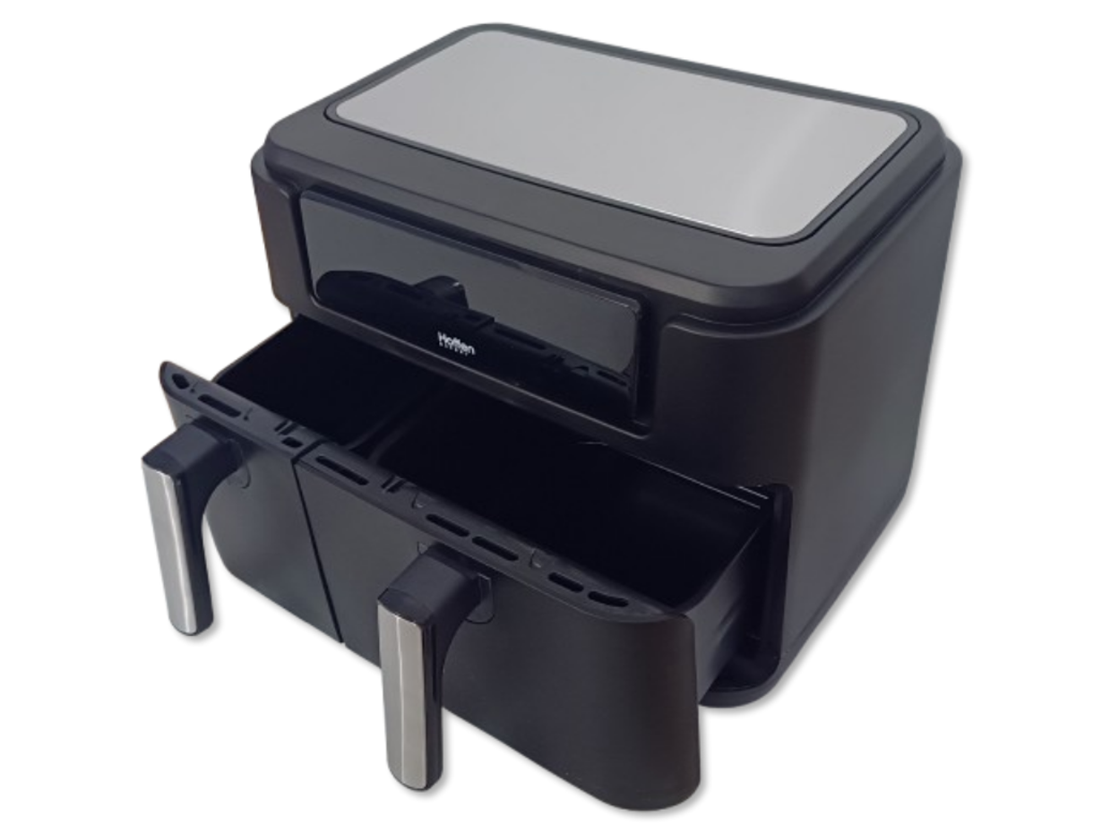 Dwukomorowa beztłuszczowa frytkownica marki Hoffen o łącznej mocy 2400W (850W+1550W) przeznaczona do duszenia i smażenia produktów spożywczych w dwóch niezależnych misach o pojemności 3,5L oraz 6L, dzięki czemu można w niej przygotować dwa dania jednocześnie. Frytkownica umożliwia przygotowanie zdrowych, a przede wszystkim lekkich i smacznych potraw. Urządzenie wyposażone jest w duży, czytelny dotykowy wyświetlacz, dzięki któremu można wybrać jeden z 10 programów automatycznych, gdzie urządzenie ustawi automatycznie czas i temperaturę pracy. Frytkownica umożliwia również ręczne ustawienie temperatury pracy zarówno dla pierwszej misy jak i drugiej misy w szerokim zakresie od 40 do 200 stopni dzięki czemu możliwe jest nie tylko pieczenie mięs i ryb ale także suszenie owoców, grzybów i warzyw. Na wyświetlaczu można również ustawić czas pracy urządzenia niezależnie dla każdej misy w zakresie od 1 do 75 minut, istnieje również opcja synchronizacji czasów. Po zakończeniu pracy urządzenie sygnalizuje koniec pracy charakterystycznym sygnałem dźwiękowym. Frytkownica jest wyposażona w nienagrzewający się uchwyt, antypoślizgowe nóżki zapewniające bezpieczeństwo podczas pracy oraz nieprzywierającą powłokę.
