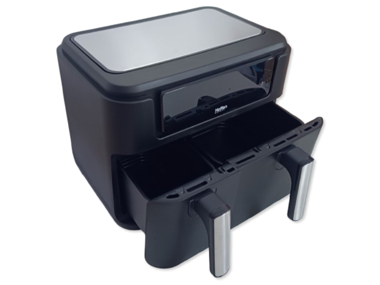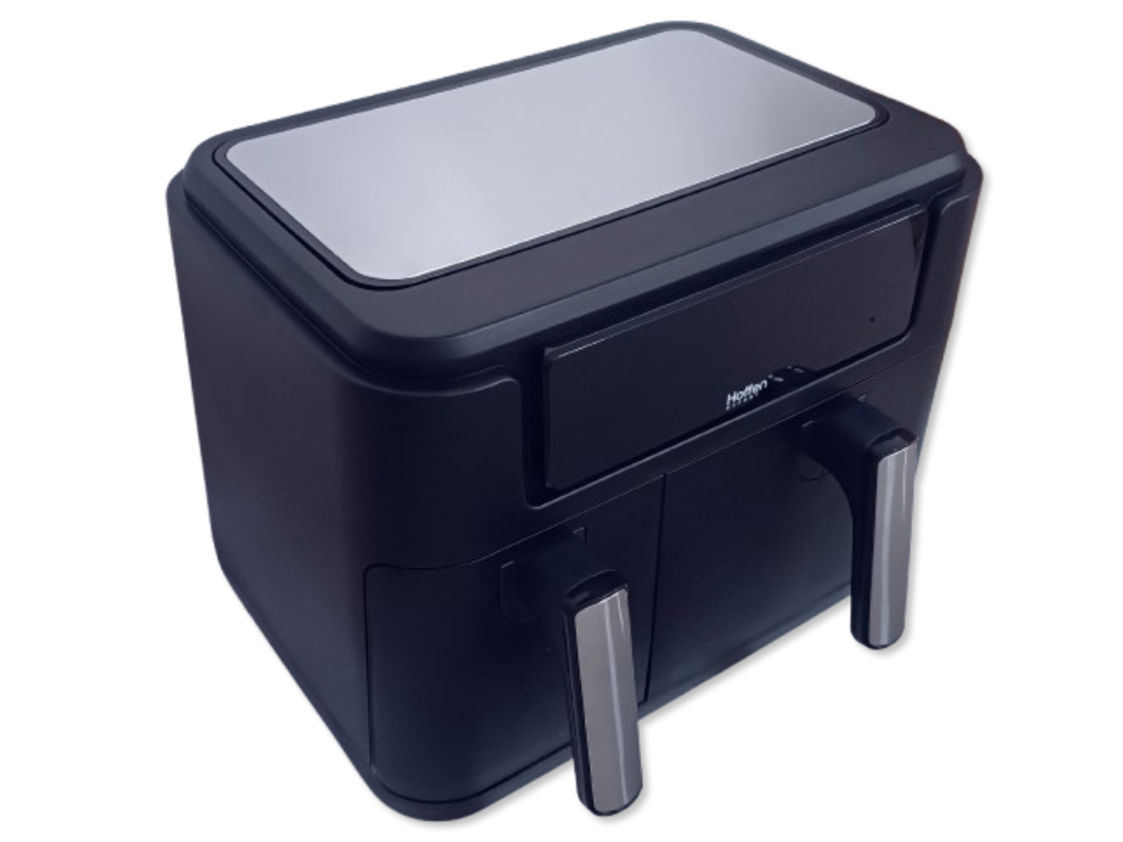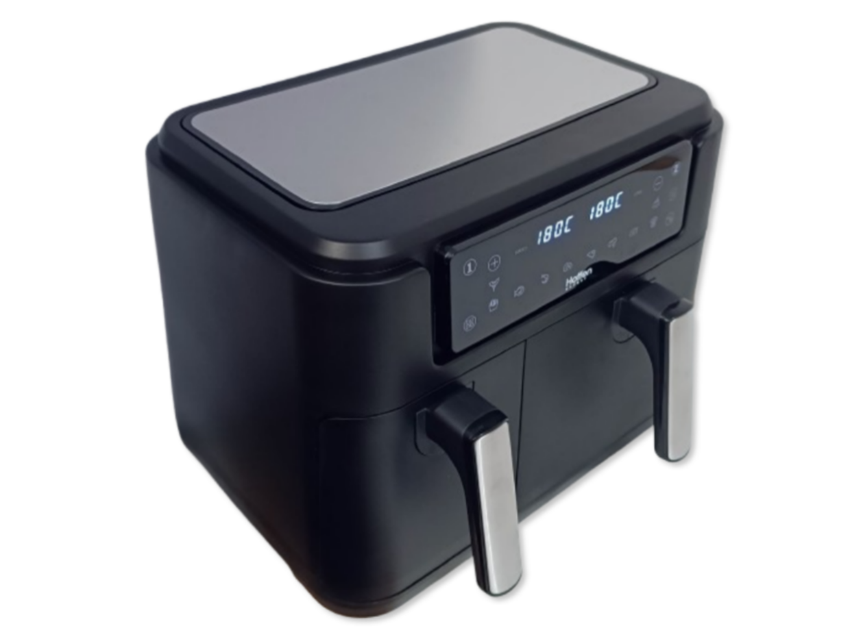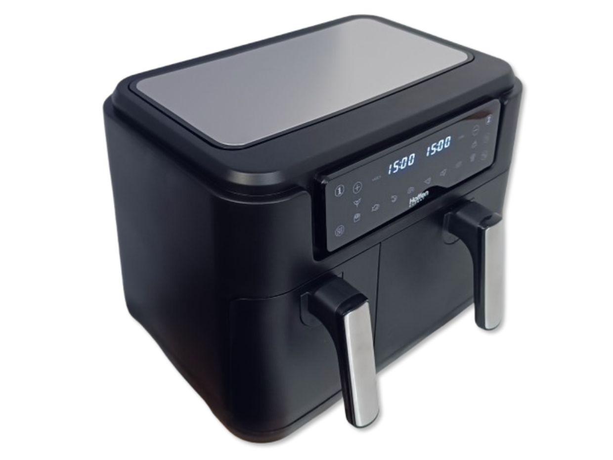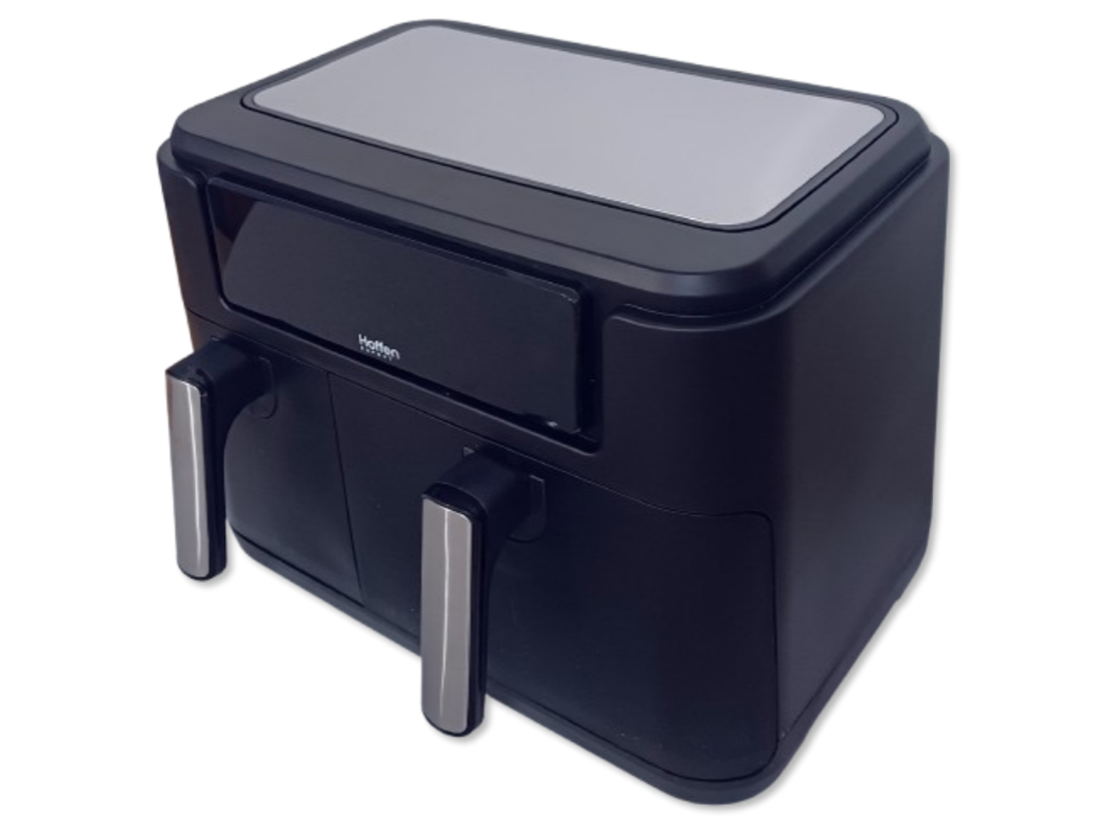 Dwukomorowa beztłuszczowa frytkownica marki Hoffen o łącznej mocy 2400W (850W+1550W) przeznaczona do duszenia i smażenia produktów spożywczych w dwóch niezależnych misach o pojemności 3,5L oraz 6L, dzięki czemu można w niej przygotować dwa dania jednocześnie. Frytkownica umożliwia przygotowanie zdrowych, a przede wszystkim lekkich i smacznych potraw. Urządzenie wyposażone jest w duży, czytelny dotykowy wyświetlacz, dzięki któremu można wybrać jeden z 10 programów automatycznych, gdzie urządzenie ustawi automatycznie czas i temperaturę pracy. Frytkownica umożliwia również ręczne ustawienie temperatury pracy zarówno dla pierwszej misy jak i drugiej misy w szerokim zakresie od 40 do 200 stopni dzięki czemu możliwe jest nie tylko pieczenie mięs i ryb ale także suszenie owoców, grzybów i warzyw. Na wyświetlaczu można również ustawić czas pracy urządzenia niezależnie dla każdej misy w zakresie od 1 do 75 minut, istnieje również opcja synchronizacji czasów. Po zakończeniu pracy urządzenie sygnalizuje koniec pracy charakterystycznym sygnałem dźwiękowym. Frytkownica jest wyposażona w nienagrzewający się uchwyt, antypoślizgowe nóżki zapewniające bezpieczeństwo podczas pracy oraz nieprzywierającą powłokę.
