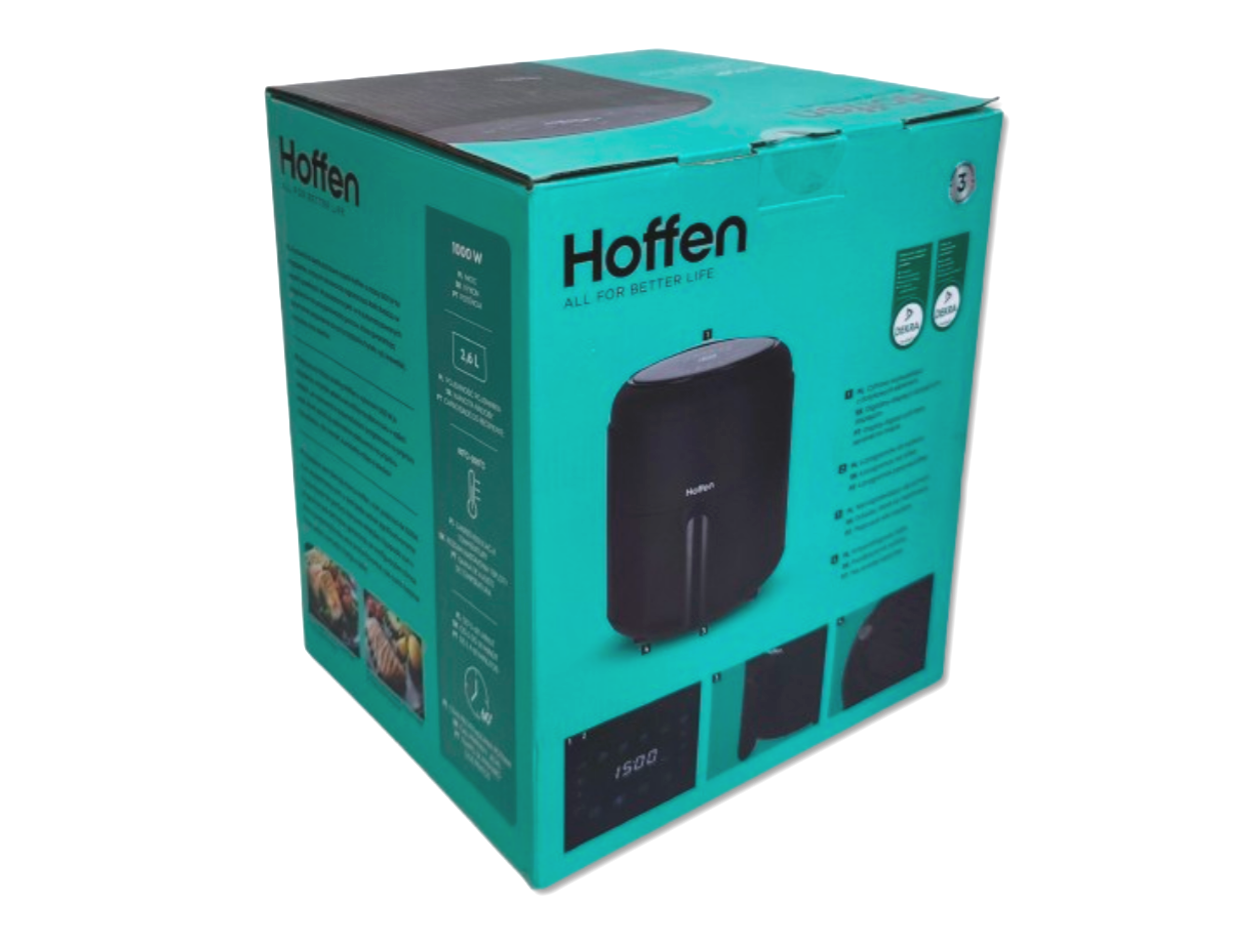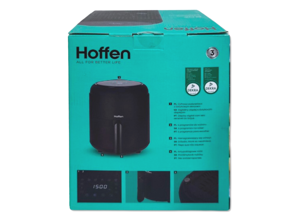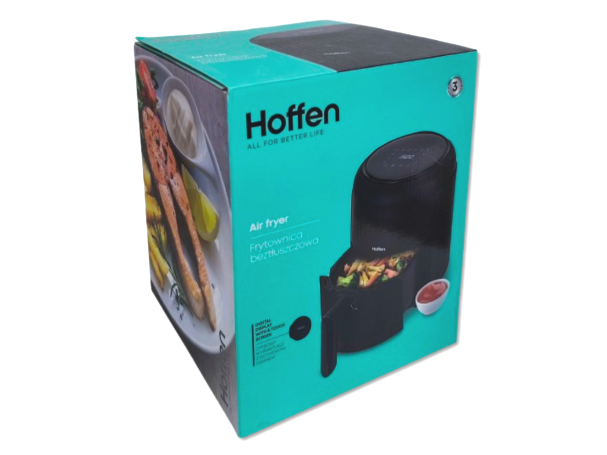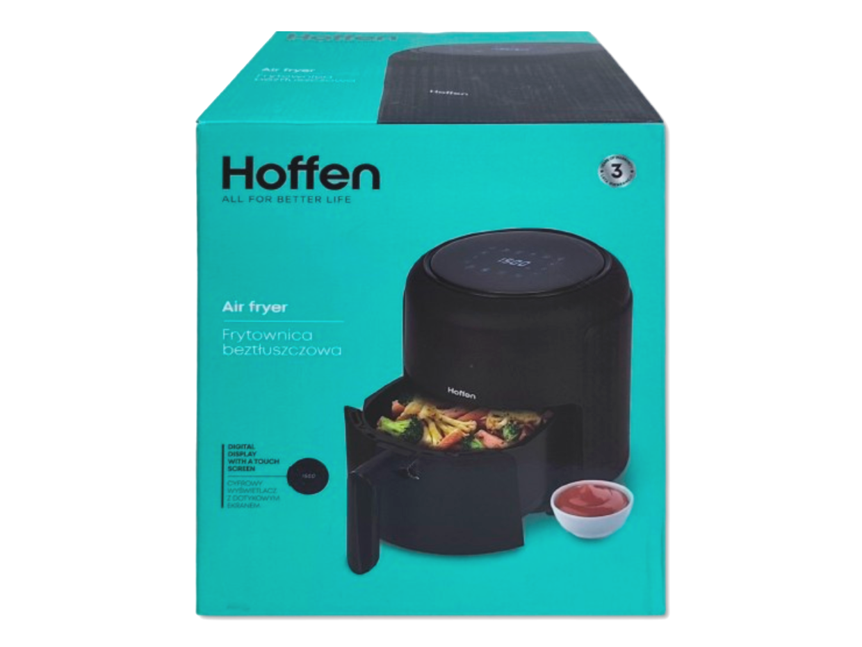Beztłuszczowa frytkownica marki Hoffen o mocy 1000W przeznaczona do duszenia i smażenia produktów spożywczych za pomocą gorącego powietrza o maksymalnej temperaturze 200 stopni w misie o pojemności 2,6l. Frytkownica umożliwia przygotowanie zdrowych, a przede wszystkim lekkich i smacznych potraw. Urządzenie wyposażone jest w duży, czytelny dotykowy wyświetlacz, dzięki któremu można wybrać jeden z 6 programów automatycznych, gdzie urządzenie ustawi automatycznie czas i temperaturę pracy lub tryb rozmrażania, który pozwala w krótkim czasie rozmrozić zamrożone produkty. Frytkownica umożliwia również ręczne ustawienie temperatury pracy w szerokim zakresie od 80 do 200 stopni (50-90 stopni w trybie rozmrażania), oraz czasu pracy w zakresie od 1 do 60 minut.Po zakończeniu pracy urządzenie automatycznie przechodzi w tryb czuwania i sygnalizuje koniec pracy sygnałem dźwiękowym. Frytkownica posiada także wygodny uchwyt, antypoślizgowe nóżki zapewniające bezpieczeństwo podczas pracy, oraz nieprzywierającą powłokę. Gwarantem i importerem urządzenia jest znana wszystkim Polska firma MPM.