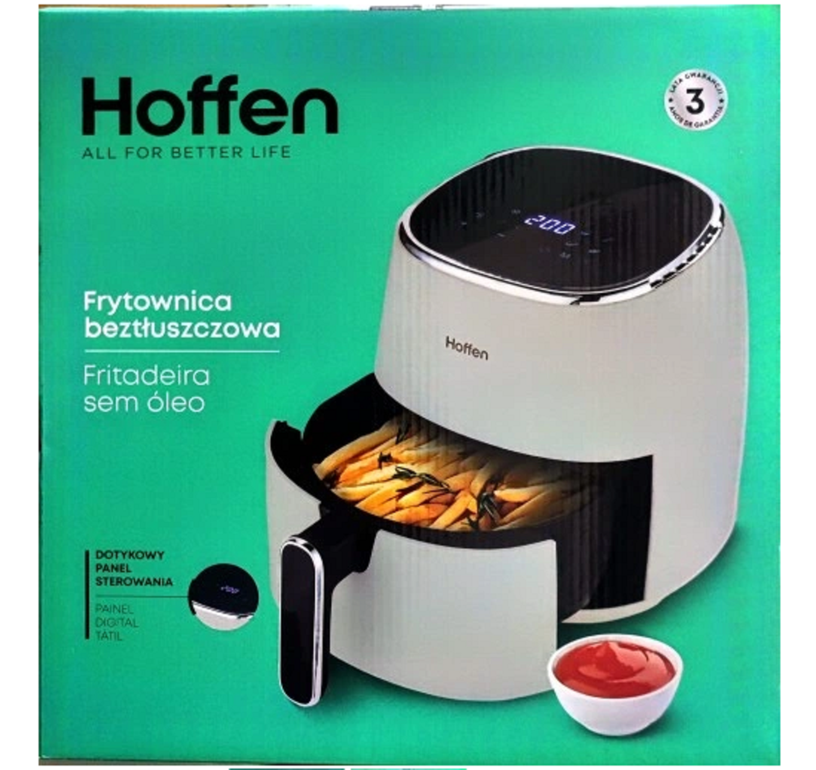 Frytownica beztłuszczowa Hoffen to szybki i zdrowy sposób na przygotowanie chrupiących frytek, mięsa, ryb, warzyw czy ciasta. Urządzenie smaży bez użycia oleju, dzięki technologii szybkiej cyrkulacji gorącego powietrza. Możesz nim w wygodny i prosty sposób sterować za pomocą panelu dotykowego połączonego z wyświetlaczem LED. Regulacja temperatury od 80 do 200°C pozwala na jej precyzyjne dopasowanie do przyrządzanego dania. Naczynie posiada powłokę zapobiegającą przywieraniu. Bezpieczeństwo użytkowania zapewnia nienagrzewający się uchwyt. Duży pojemnik umożliwi nam przyrządzanie obiadu dla całej rodziny.