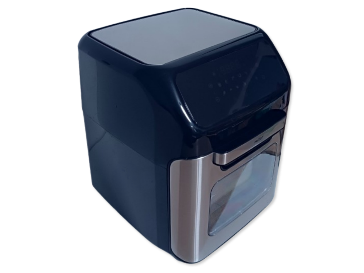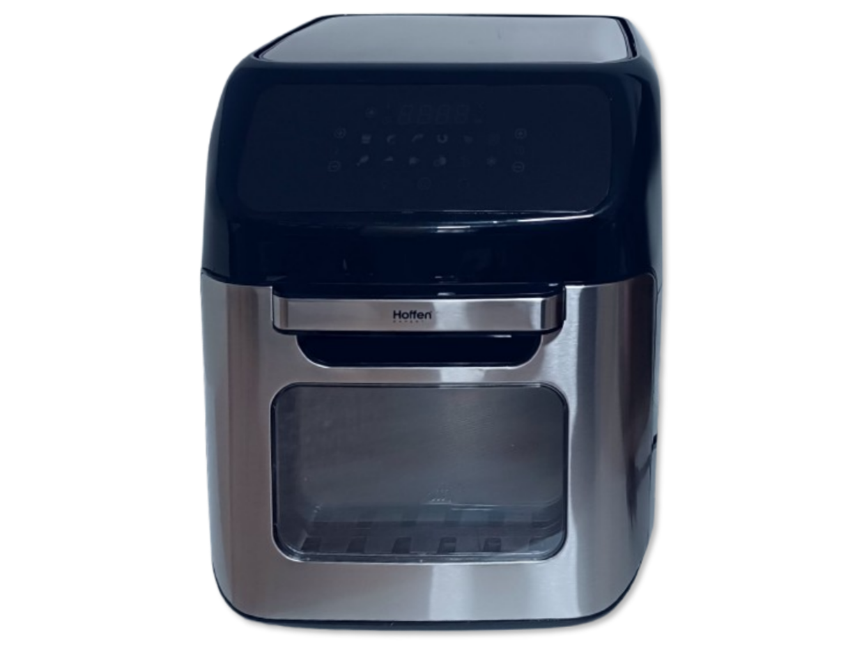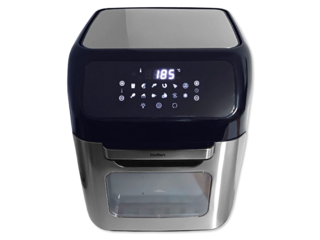 Wielofunkcyjna beztłuszczowa frytkownica marki Hoffen o mocy 1800W przeznaczona do pieczenia produktów spożywczych za pomocą gorącego powietrza o maksymalnej temperaturze 200 stopni. Frytkownica umożliwia przygotowanie zdrowych, a przede wszystkim lekkich i smacznych potraw. Dzięki zastosowaniu technologii szybkiej cyrkulacji gorącego powietrza możliwe jest usmażenie chrupiących frytek, ryb, mięsa, warzyw czy też ciasta bez użycia oleju. Urządzenie wyposażone jest w duży, czytelny dotykowy wyświetlacz, dzięki któremu można wybrać jeden z 12 programów automatycznych, gdzie urządzenie ustawi automatycznie czas i temperaturę pracy. Frytkownica umożliwia również ręczne ustawienie temperatury pracy w szerokim zakresie od 80 do 200 stopni (30-80 stopni w trybie dehydratora), dzięki czemu możliwe jest pieczenie mięs i ryb a także w trybie dehydratora suszenie owoców, grzybów i warzyw. Na wyświetlaczu można również ustawić czas pracy urządzenia w zakresie od 1 do 90 minut (2-24h w trybie dehydratora), po zakończeniu pracy urządzenie sygnalizuje koniec pracy pięciokrotnym sygnałem dźwiękowym. Frytkownica posiada uchylane drzwiczki, komorę grzewczą o wymiarach 18,5x24x26cm, rożen, obrotowy kosz o średnicy 14cm i szerokości 20cm oraz kosz o pojemności 4,5L (9x20x22cm). Frytkownica jest także wyposażona w nienagrzewający się uchwyt, antypoślizgowe nóżki zapewniające bezpieczeństwo podczas pracy oraz nieprzywierającą powłokę.