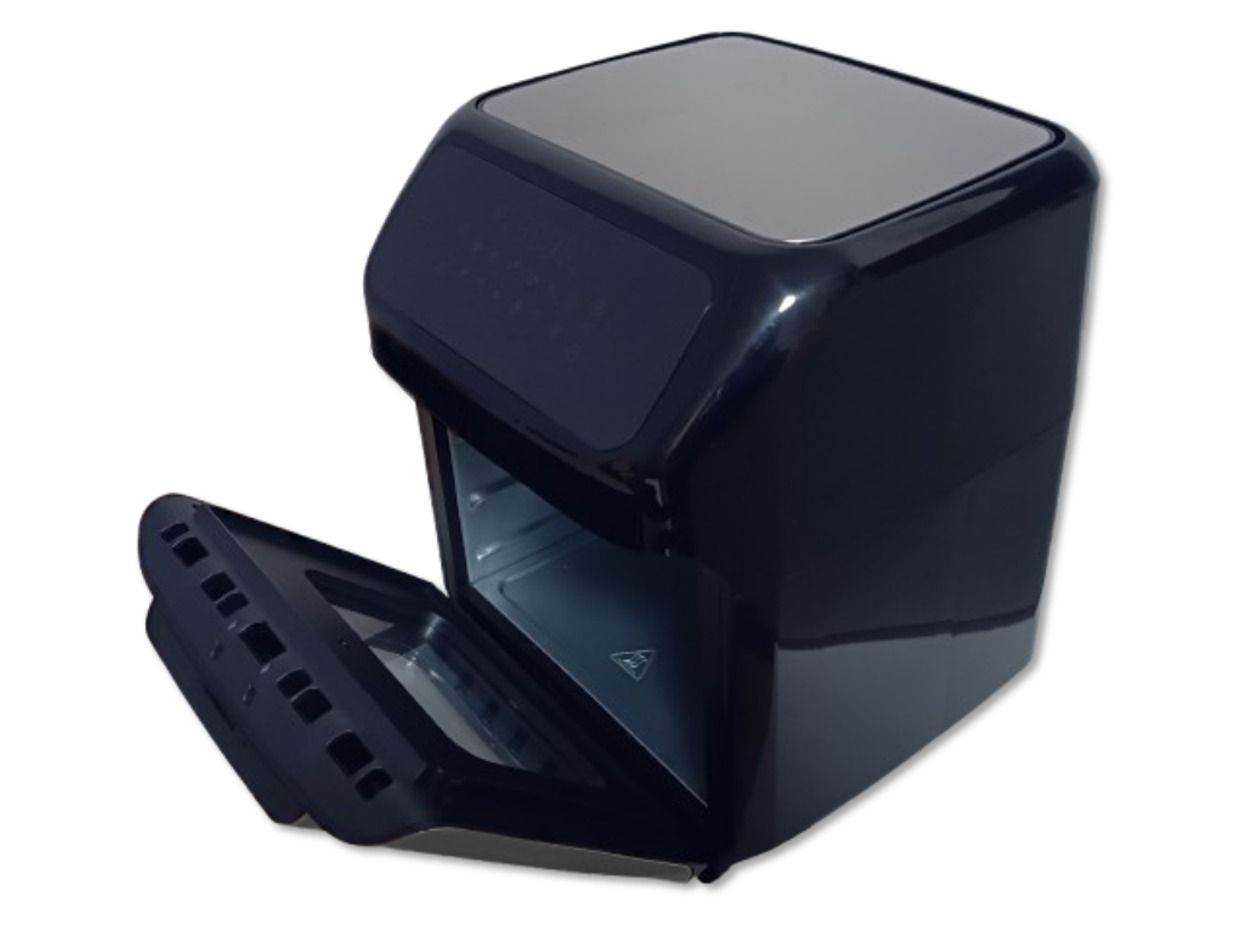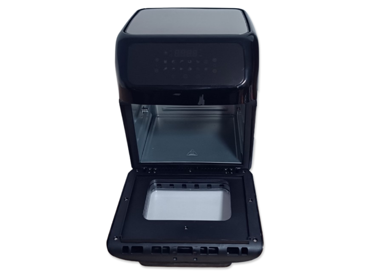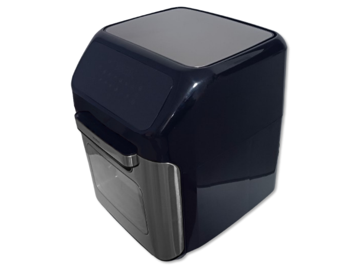 Wielofunkcyjna beztłuszczowa frytkownica marki Hoffen o mocy 1800W przeznaczona do pieczenia produktów spożywczych za pomocą gorącego powietrza o maksymalnej temperaturze 200 stopni. Frytkownica umożliwia przygotowanie zdrowych, a przede wszystkim lekkich i smacznych potraw. Dzięki zastosowaniu technologii szybkiej cyrkulacji gorącego powietrza możliwe jest usmażenie chrupiących frytek, ryb, mięsa, warzyw czy też ciasta bez użycia oleju. Urządzenie wyposażone jest w duży, czytelny dotykowy wyświetlacz, dzięki któremu można wybrać jeden z 12 programów automatycznych, gdzie urządzenie ustawi automatycznie czas i temperaturę pracy. Frytkownica umożliwia również ręczne ustawienie temperatury pracy w szerokim zakresie od 80 do 200 stopni (30-80 stopni w trybie dehydratora), dzięki czemu możliwe jest pieczenie mięs i ryb a także w trybie dehydratora suszenie owoców, grzybów i warzyw. Na wyświetlaczu można również ustawić czas pracy urządzenia w zakresie od 1 do 90 minut (2-24h w trybie dehydratora), po zakończeniu pracy urządzenie sygnalizuje koniec pracy pięciokrotnym sygnałem dźwiękowym. Frytkownica posiada uchylane drzwiczki, komorę grzewczą o wymiarach 18,5x24x26cm, rożen, obrotowy kosz o średnicy 14cm i szerokości 20cm oraz kosz o pojemności 4,5L (9x20x22cm). Frytkownica jest także wyposażona w nienagrzewający się uchwyt, antypoślizgowe nóżki zapewniające bezpieczeństwo podczas pracy oraz nieprzywierającą powłokę.