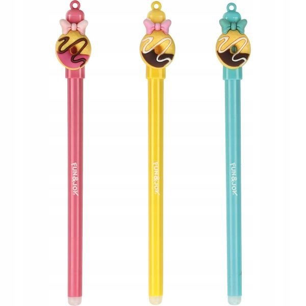 Długopisy z wymazywalnym tuszem oraz ze integrowaną gumką służącą do ścierania tuszu. Gumka do wymazywania umieszczona na końcu obudowy. Grubość linii pisania: 0,7 mm. Wkład w kolorze niebieskim. Wzór: donat.