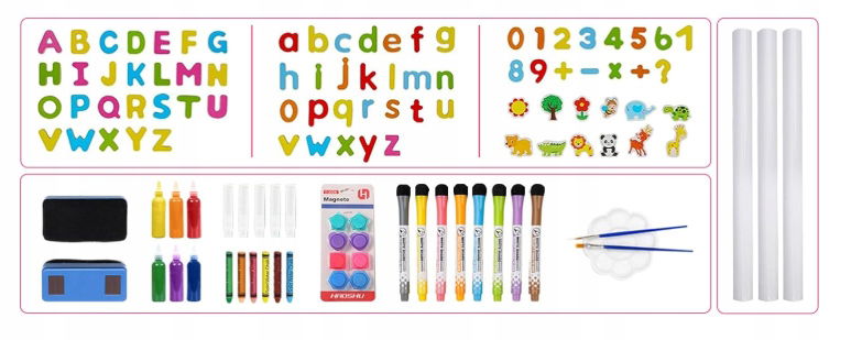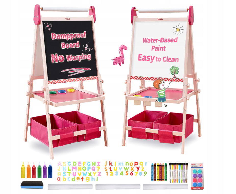 - ✴️Zestaw All-in-One, idealny prezent dla utalentowanych artystów - sztalugi FUNLIO z tablicą dla dzieci z kredą i magnesem/białą tablicą. Na wierzchniej stronie znajduje się uchwyt na rolki papieru z trzema rolkami papieru. Otrzymasz również 3 gumki do ścierania, 5 kredek, 6 bezpyłowych kredek, 8 kolorowych markerów, 1 zestaw kolorów, 5 kolorowych zestawów magnesów i 1 linijkę magnetyczną. Wskazówka: w celu uzyskania lepszych rezultatów czyszczenia zalecamy przecieranie wilgotną szmatką lub wilgotną gumką.