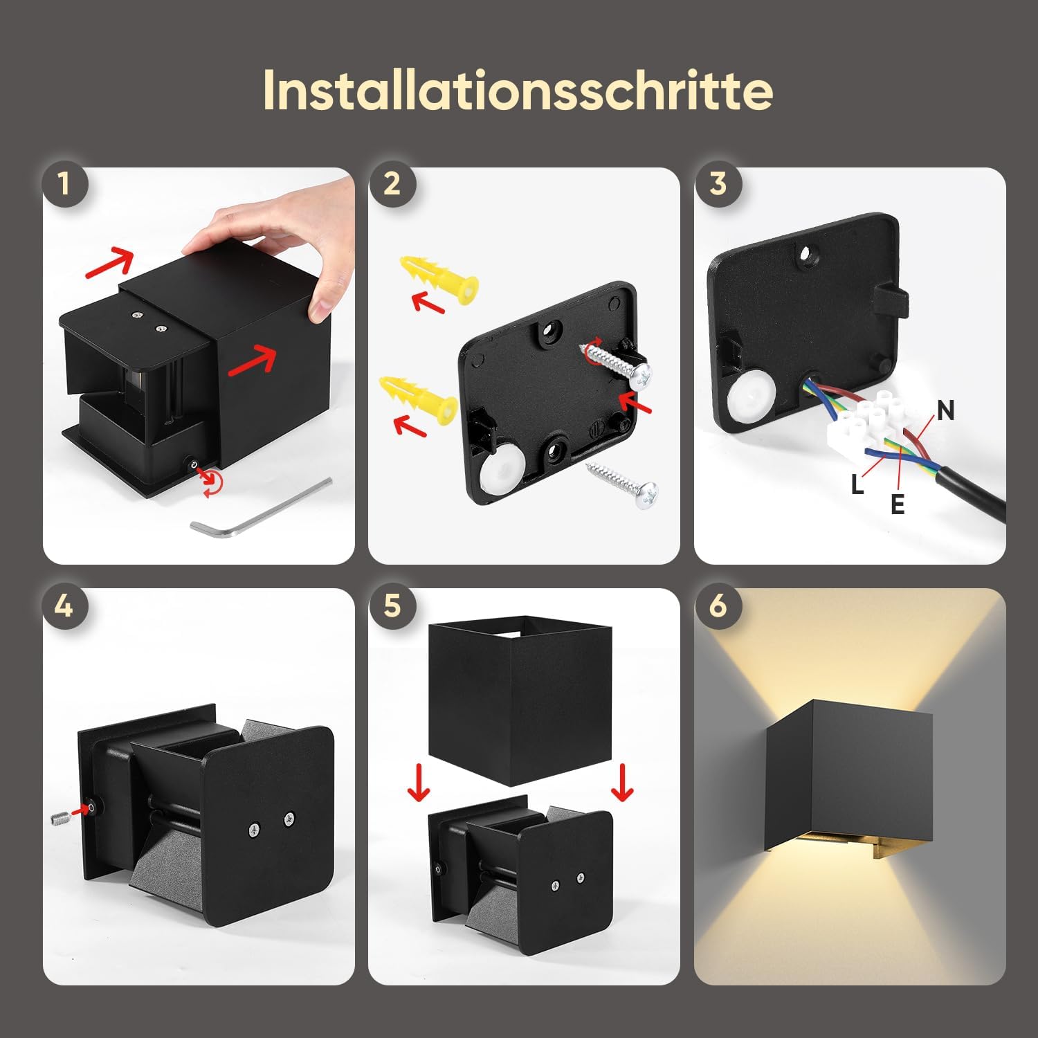 Poziom ochrony: Zewnętrzna lampa ścienna IP65, wodoodporna i pyłoszczelna; Korpus lampy wykonany jest z wysokiej jakości aluminium, malowania proszkowego, matowej powierzchni, antykorozyjnej i rdzy. Energooszczędne i przyjazne dla środowiska lampy LED, z jasnym i jednolitym światłem, bez lampy błyskowej, niewymienne źródła światła mają dłuższą żywotność i są bezpieczniejsze.