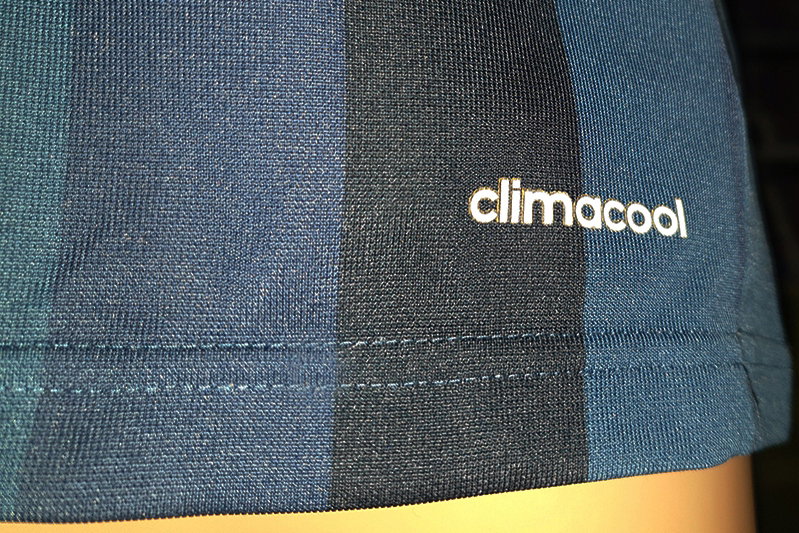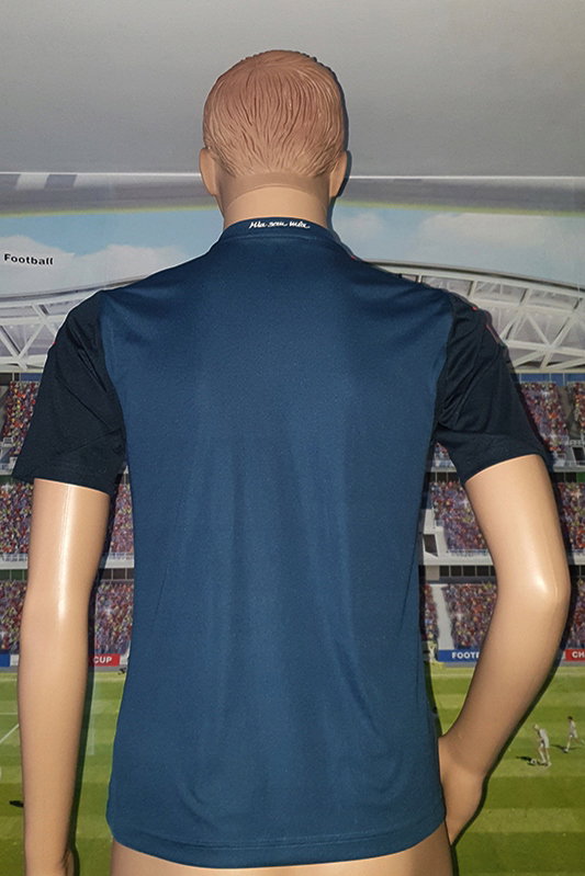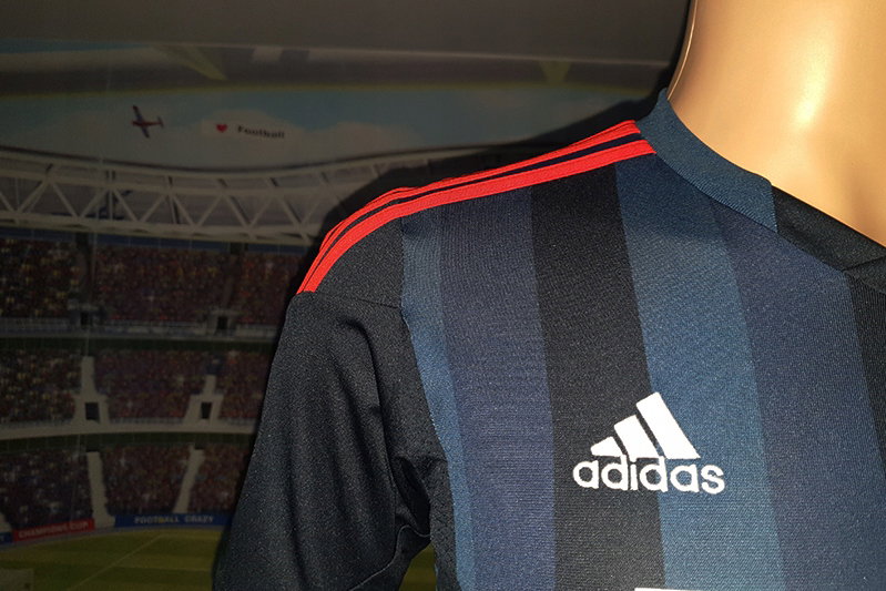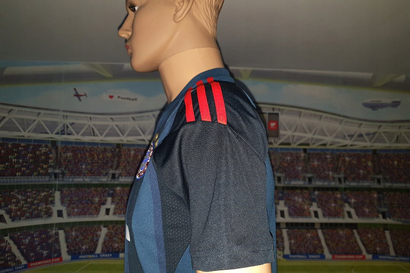 Koszulka posiada krótkie rękawki i dominują w niej czarno – granatowe pionowe pasy wraz z czerwono – biało – srebrno - złotymi „dodatkami” zaś kołnierzyk tego piłkarskiego trykotu jest wykonany w stójkę.