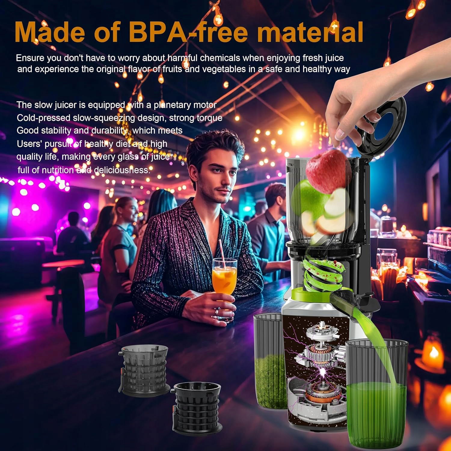 - Nie martw się o toksyczne substancje chemiczne! Nasza sokowirówka wolnoobrotowa wykonana jest z materiałów wolnych od BPA , co zapewnia bezpieczne i zdrowe doświadczenie podczas spożywania świeżych owoców i warzyw. Doskonała dla wegan, entuzjastów fitnessu i osób dbających o zdrowie