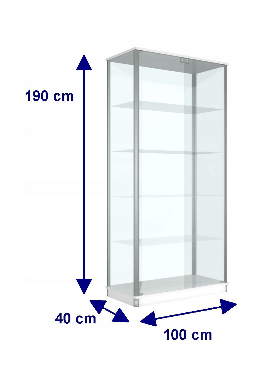 Elegancka szklana gablota 100x40x190 zamykana na klucz. Jest wykonana na bazie solidnych profili aluminiowych srebrnych, w których zastosowane są uszczelki zabezpieczające przed kurzem i brzęczeniem szyb.
