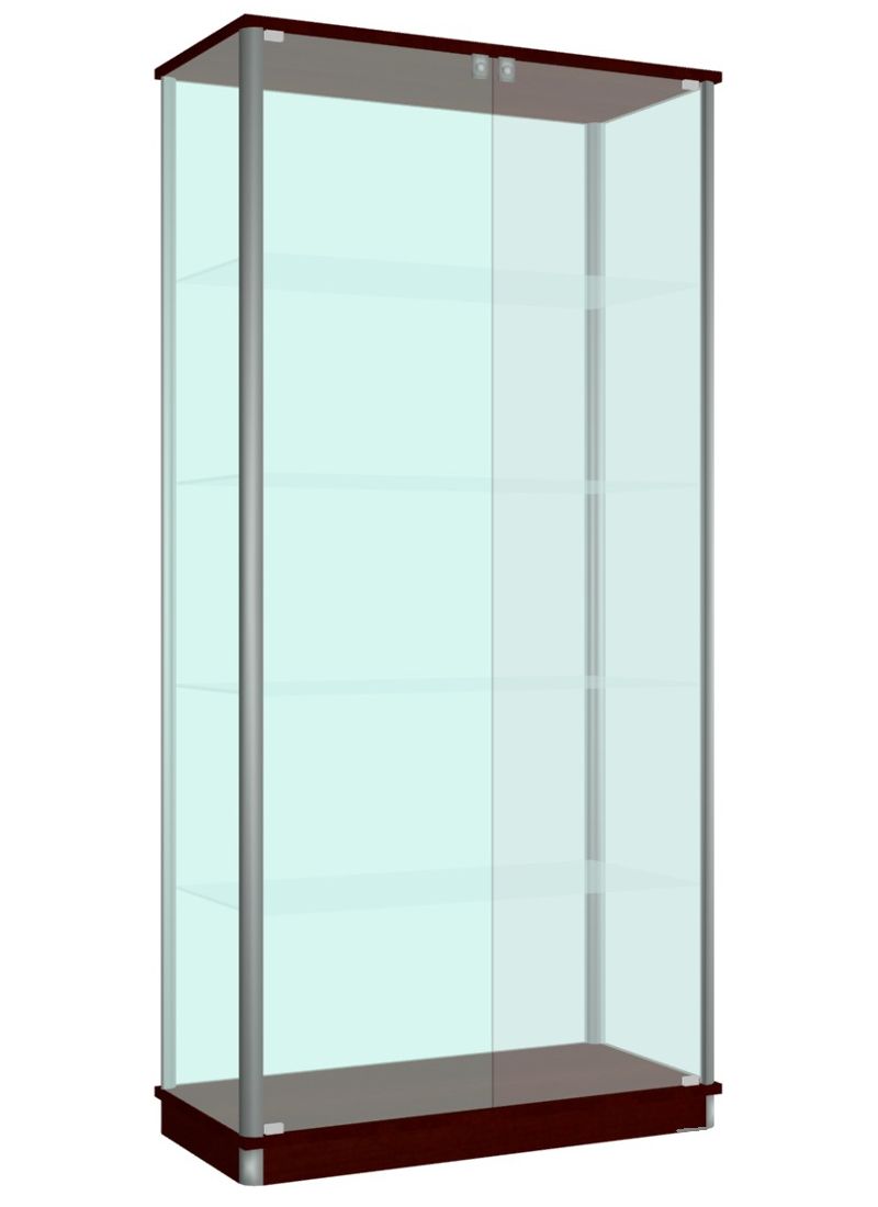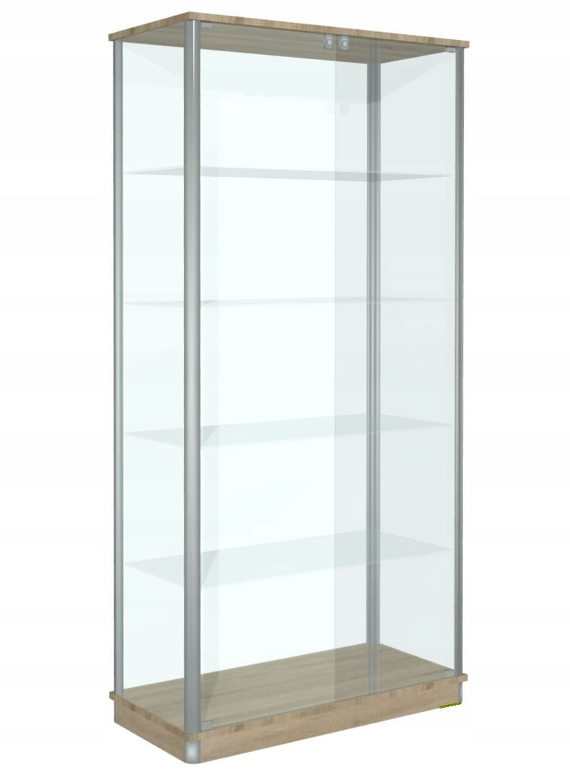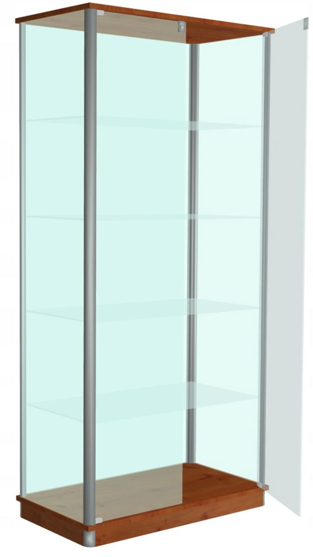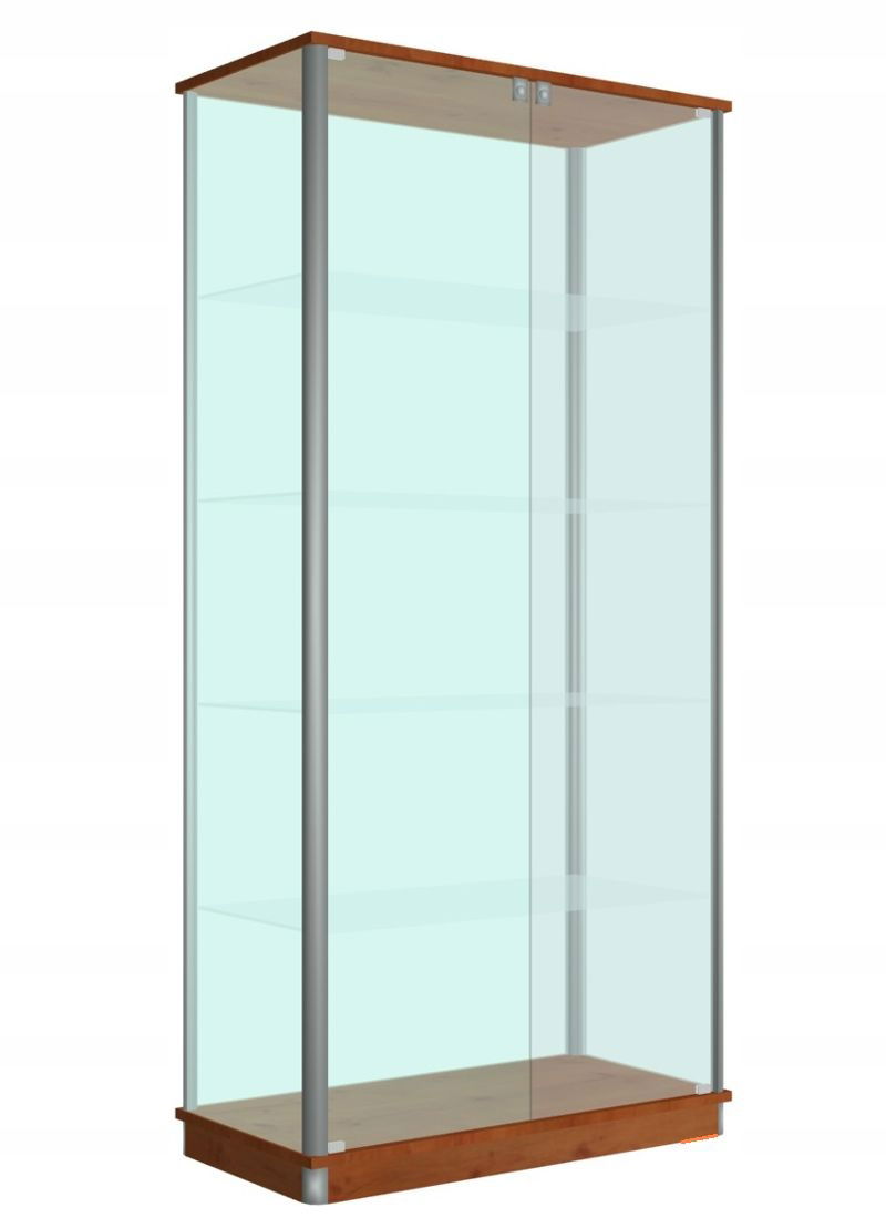 Polecamy elegancką gablotę szklaną GWS100 o wymiarach 100x40x190 zamykaną na klucz. Witryna jest wykonana na bazie solidnych profili aluminiowych anodowanych, w których zastosowane są uszczelki zabezpieczające przed kurzem i brzęczeniem szyb. Gablota ze szkła o grubości 5-6mm, przeszklona z 4 stron. Posiada 2 skrzydłowe drzwi szklane 6mm. Każde skrzydło jest wyposażone w zamek zamontowany na górze. Wieniec górny i cokół są z płyty laminowanej o grubości 18mm w nowoczesnych kolorach do wyboru z palety kolorów. W środku gabloty są 4 szklane półki o grubości szkła 6mm. Udźwig na jedna półkę szacuje się na 9kg. Dodatkowym atutem gabloty jest możliwość regulacji wysokości półek.