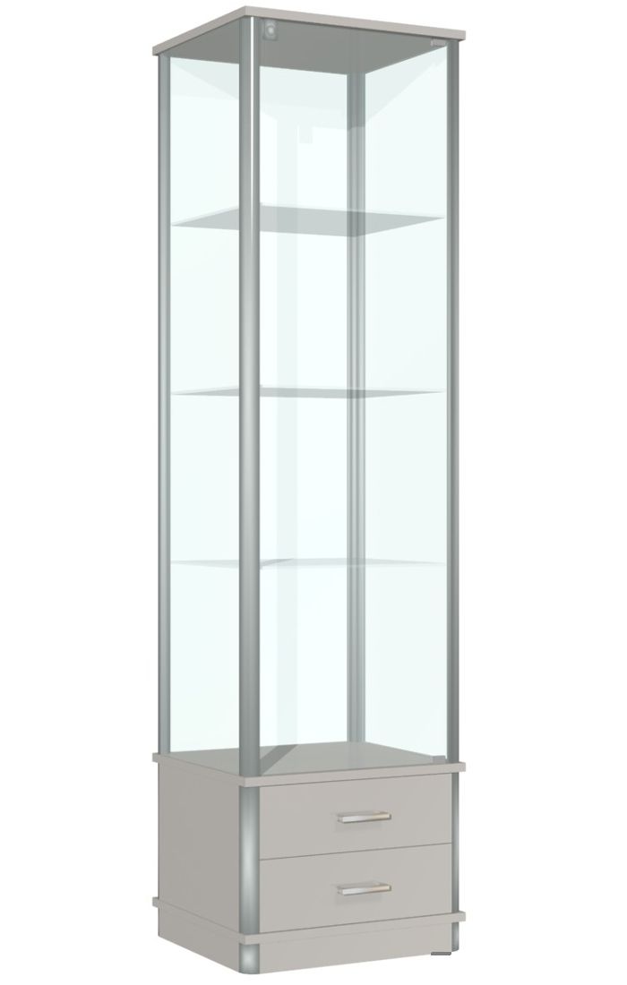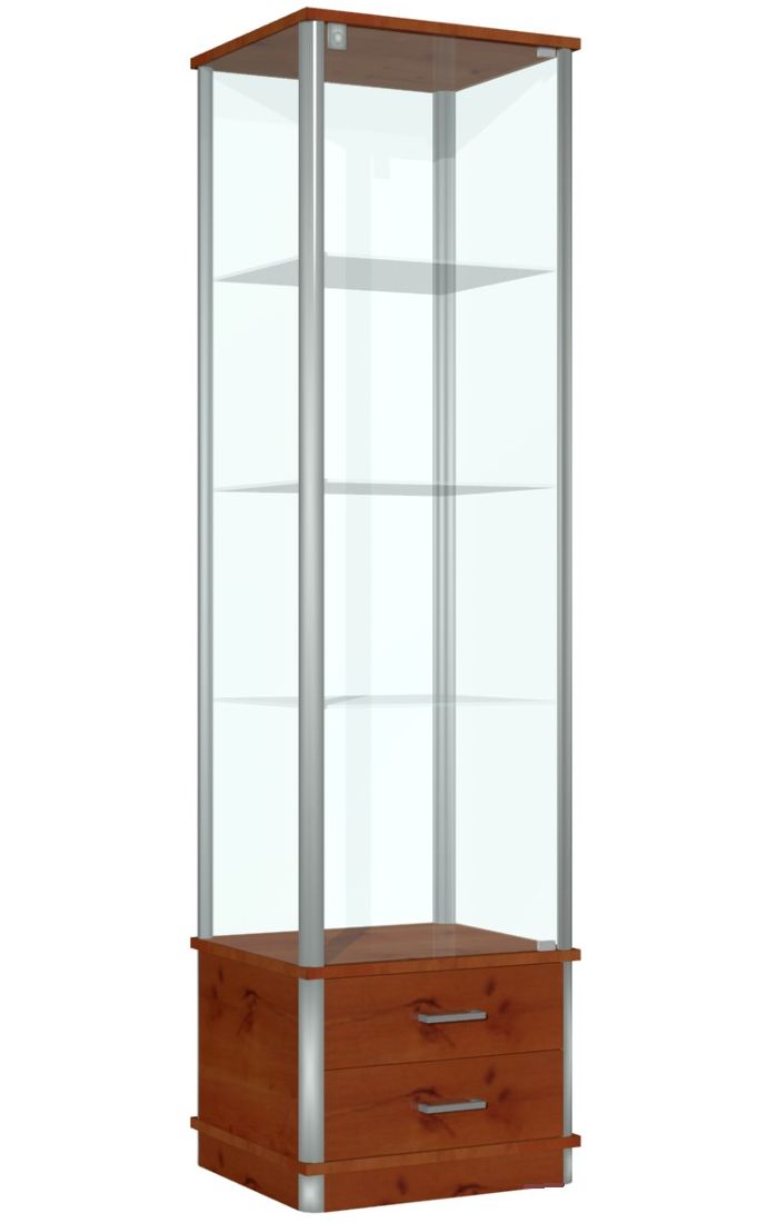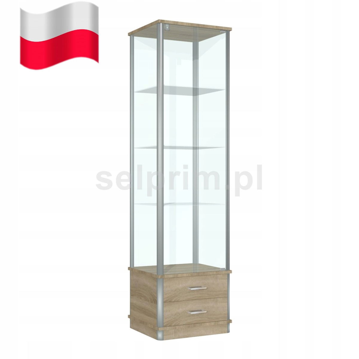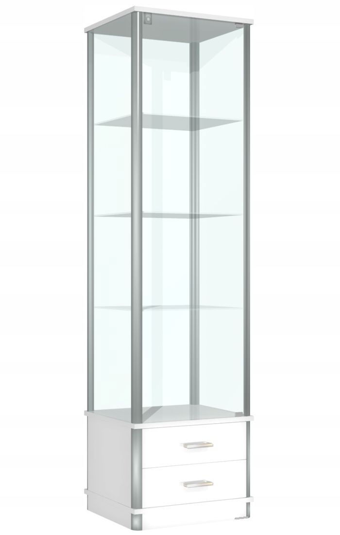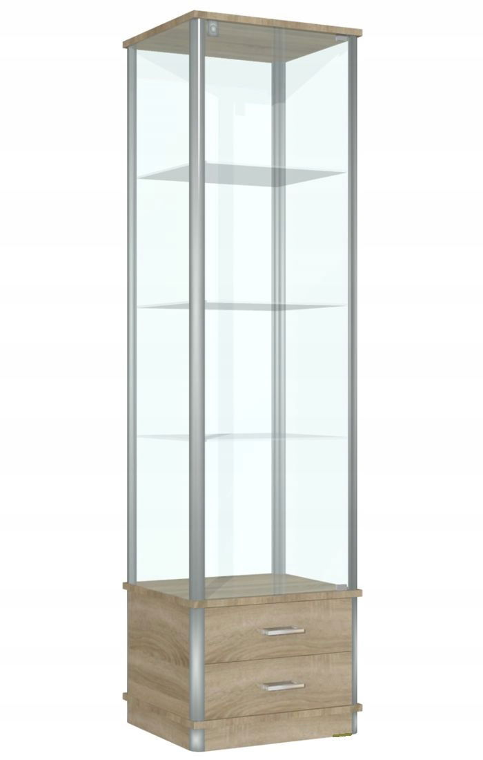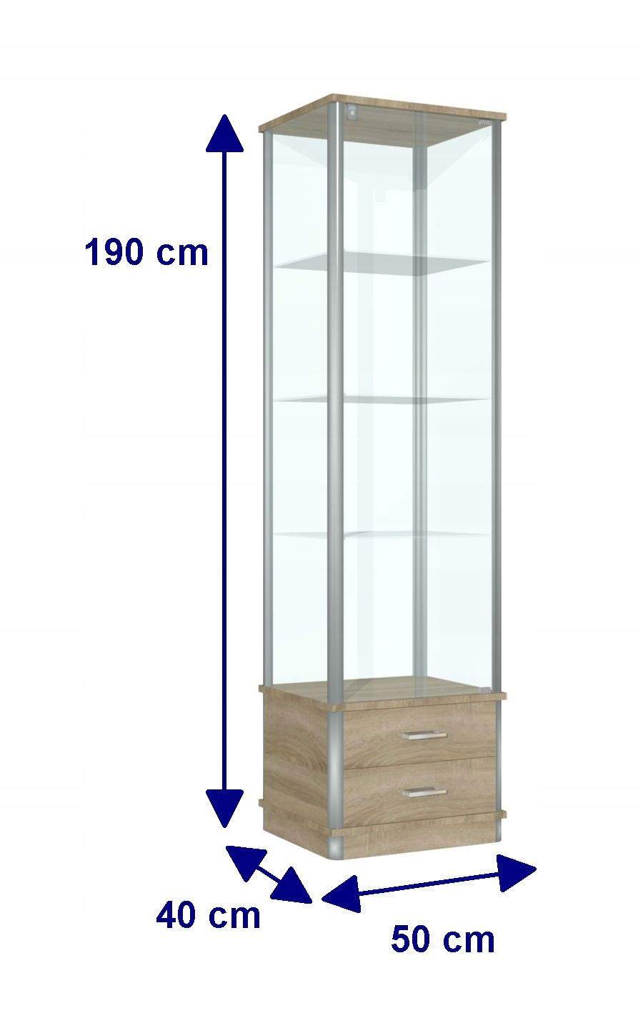 Szklana gablota 50x40x190 z 2 szufladami i przeszkloną górną częścią zamykaną na klucz na bazie profili aluminiowych anodowanych.