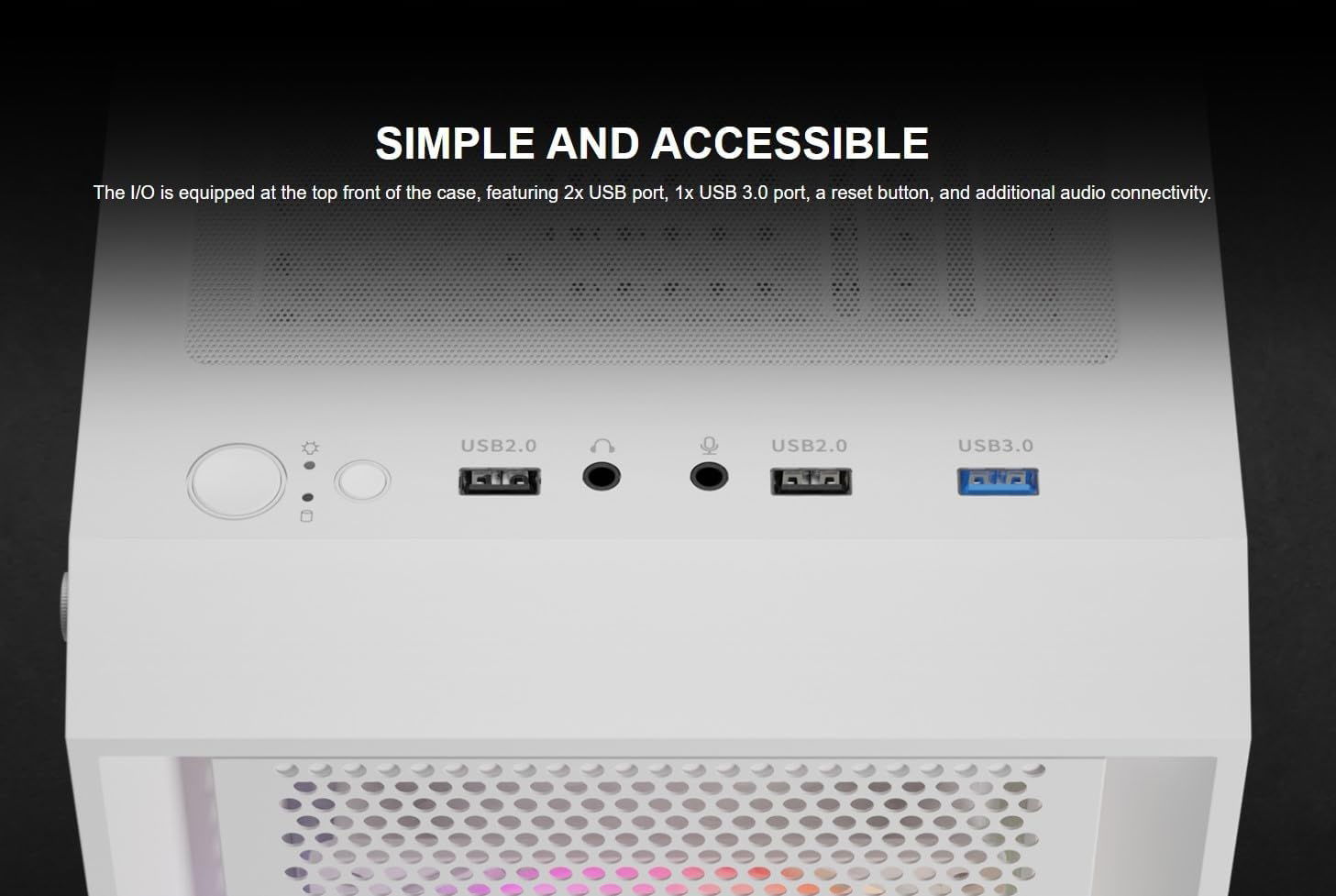 - Panel I/O: Wyposażony w 1x USB 3.0, 2x USB 2.0, złącza HD Audio oraz przycisk do kontroli podświetlenia LED.