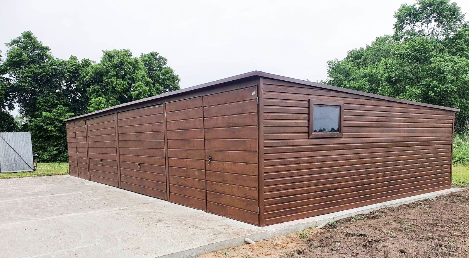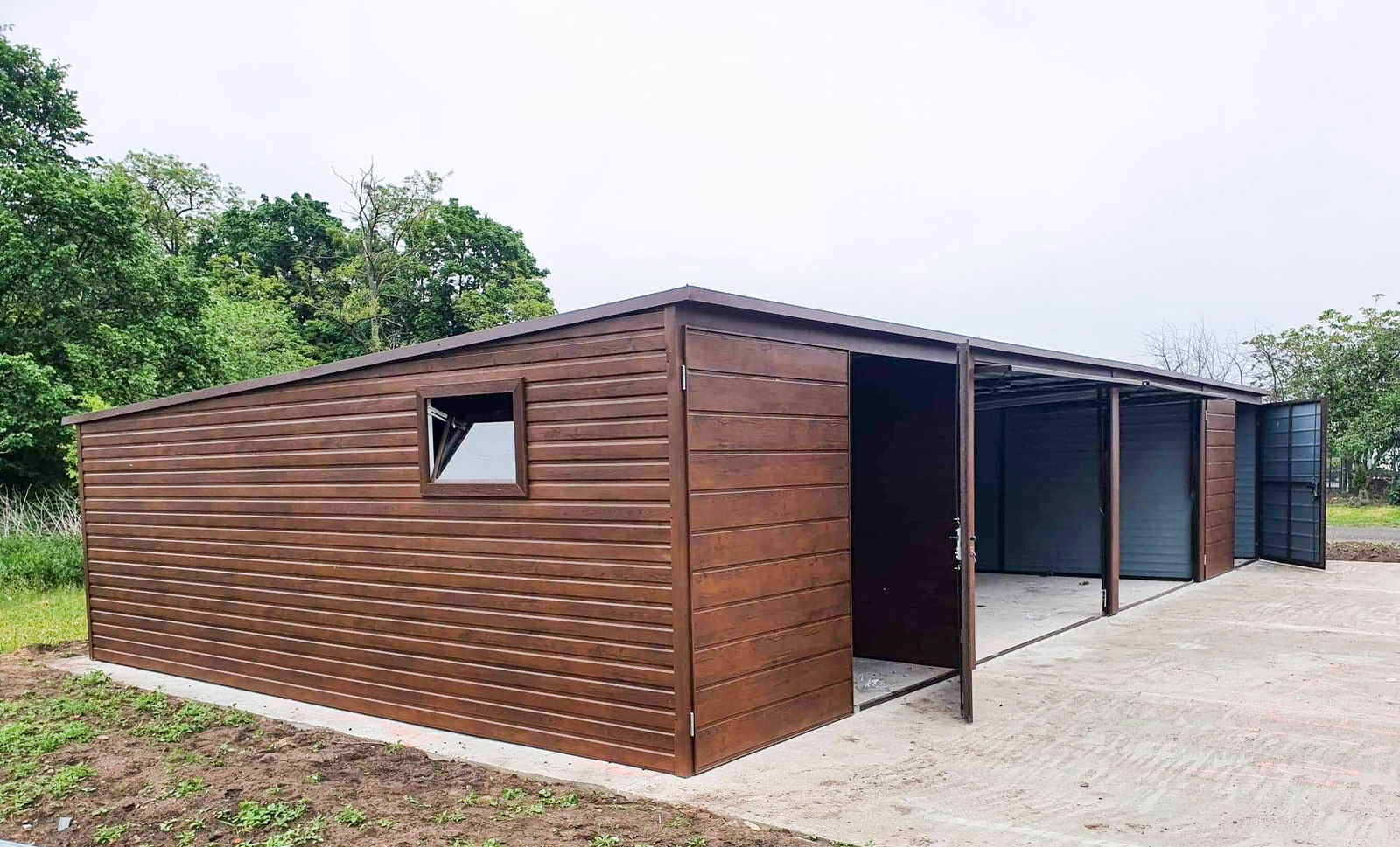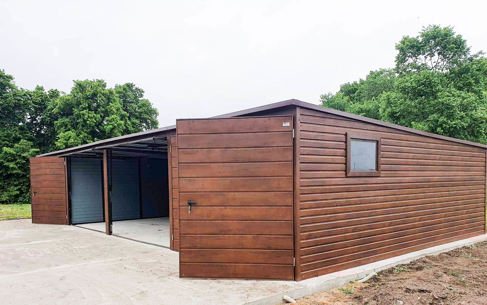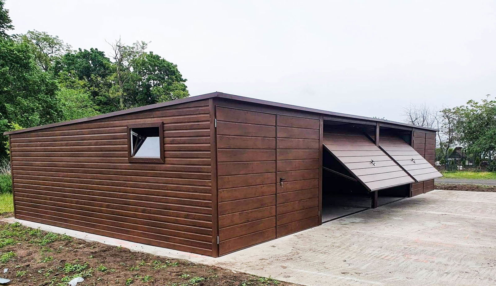 szerokość: 12m długość: 5m dach: spad w tył ciemny brąz mat BTX 8017 2x brama: uchylna t17 ciemny orzech 2x brama: dwuskrzydłowa t17 ciemny orzech (kwatery) Przetłoczenie ścian t8 poziom ciemny orzech 2x okno uchylne (ciemny orzech) wysokość ścian tył: 190 wysokość ścian przód: 213 cm. wysokość wjazdu 195 cm Ściany: Nowy mocniejszy trapez poziomy t8 „ciemny orzech" Konstrukcja wzmocniona profilami zamkniętymi ocynkowanymi Dach: „ciemny brąz mat BTX 8017” Zamki + Klucze nity + wkręty w kolorze garażu obróbki ścian ciemny orzech obróbki dachu ciemny brąz mat BTX 8017