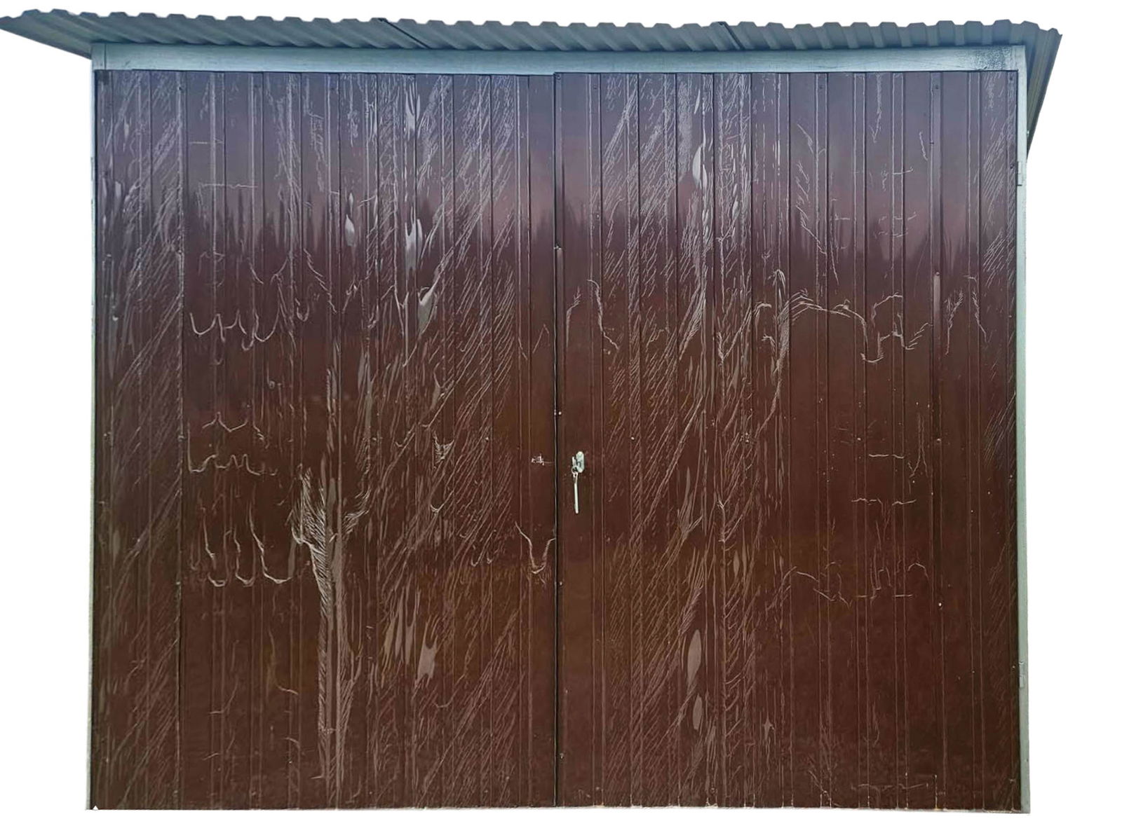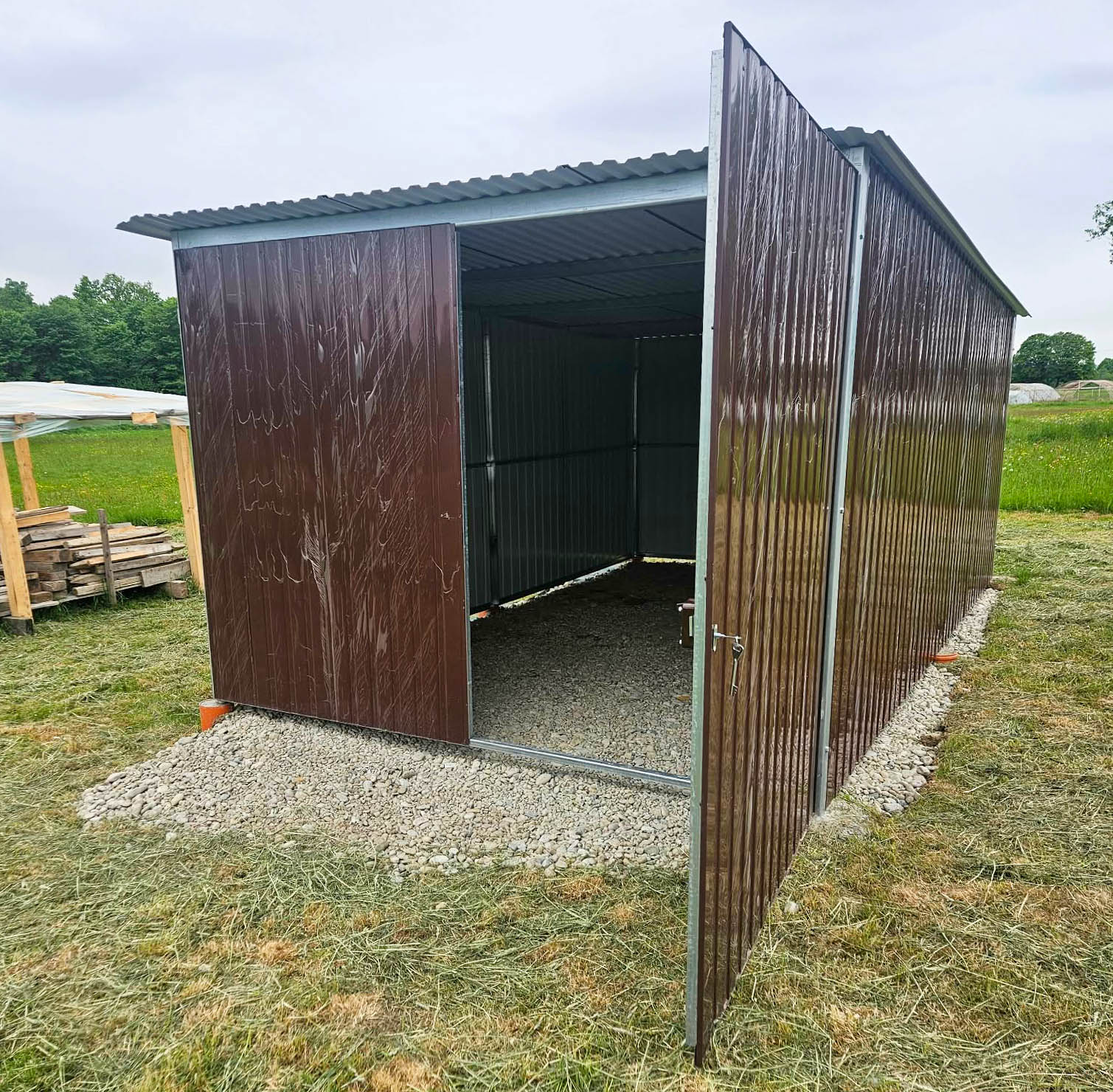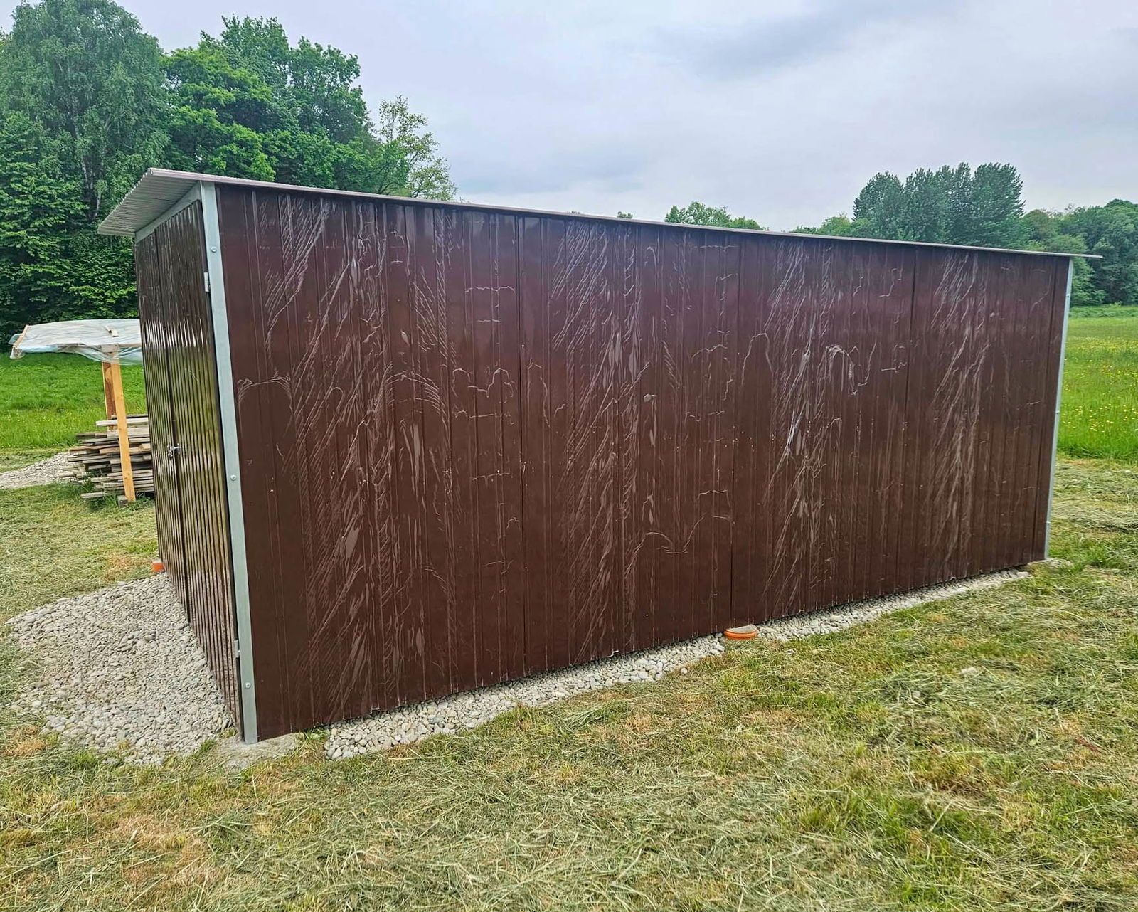 Garaż blaszany 3x5m wolnostojący - brama - ciemny brąz - spad w tył GB148