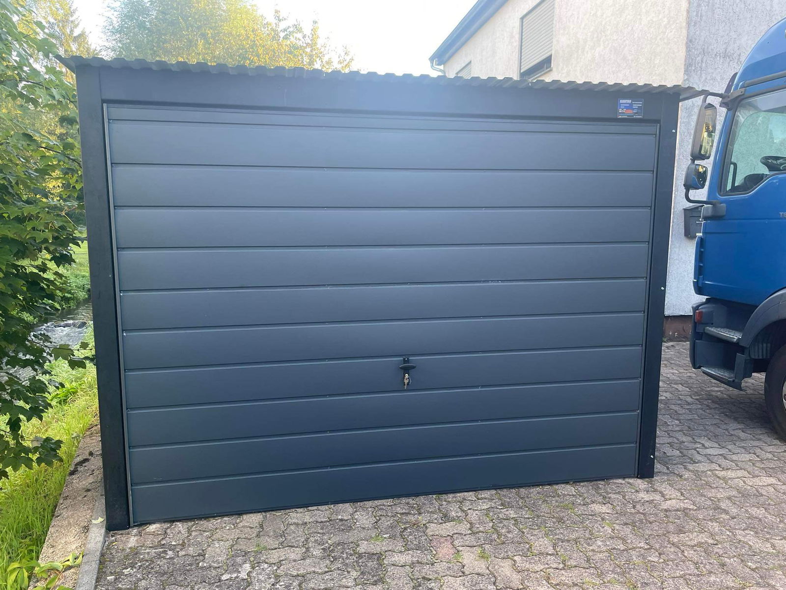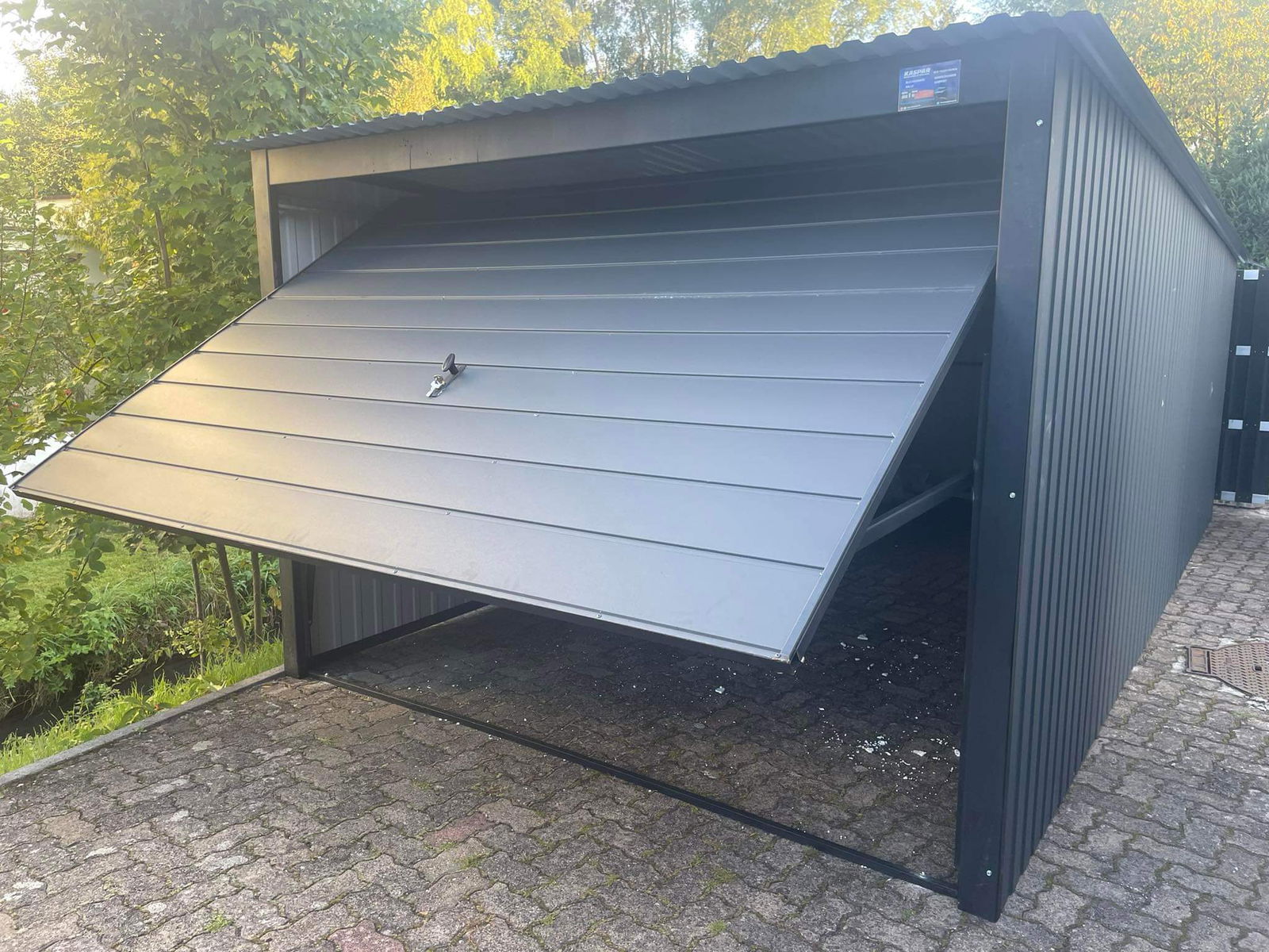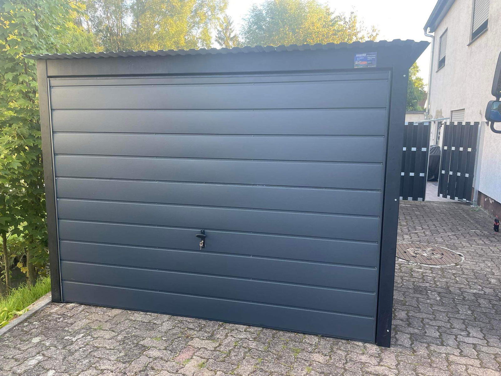 Garaż blaszany 3x7 brama uchylna - okno PCV - antracyt Dach spad w tył GB160