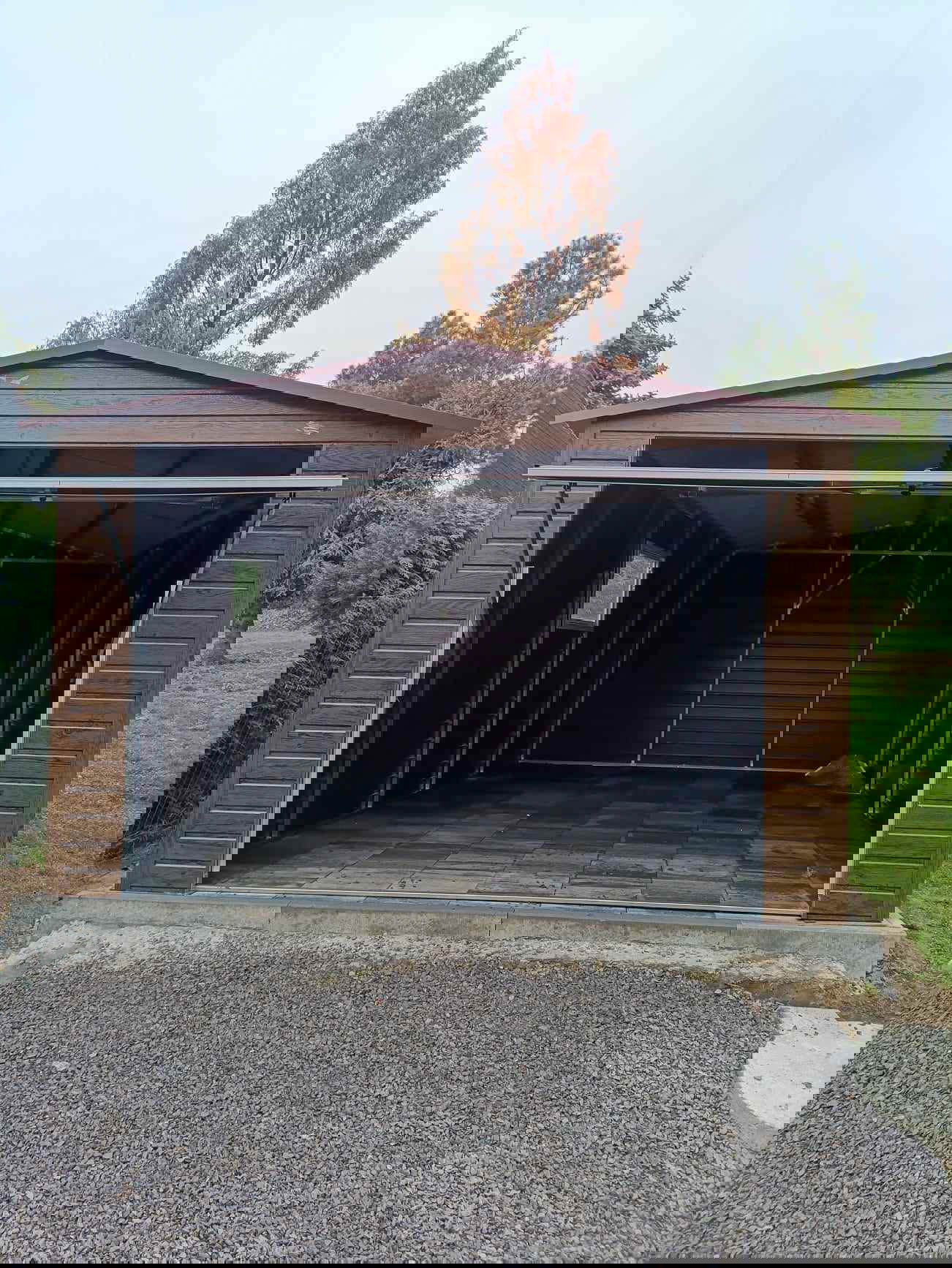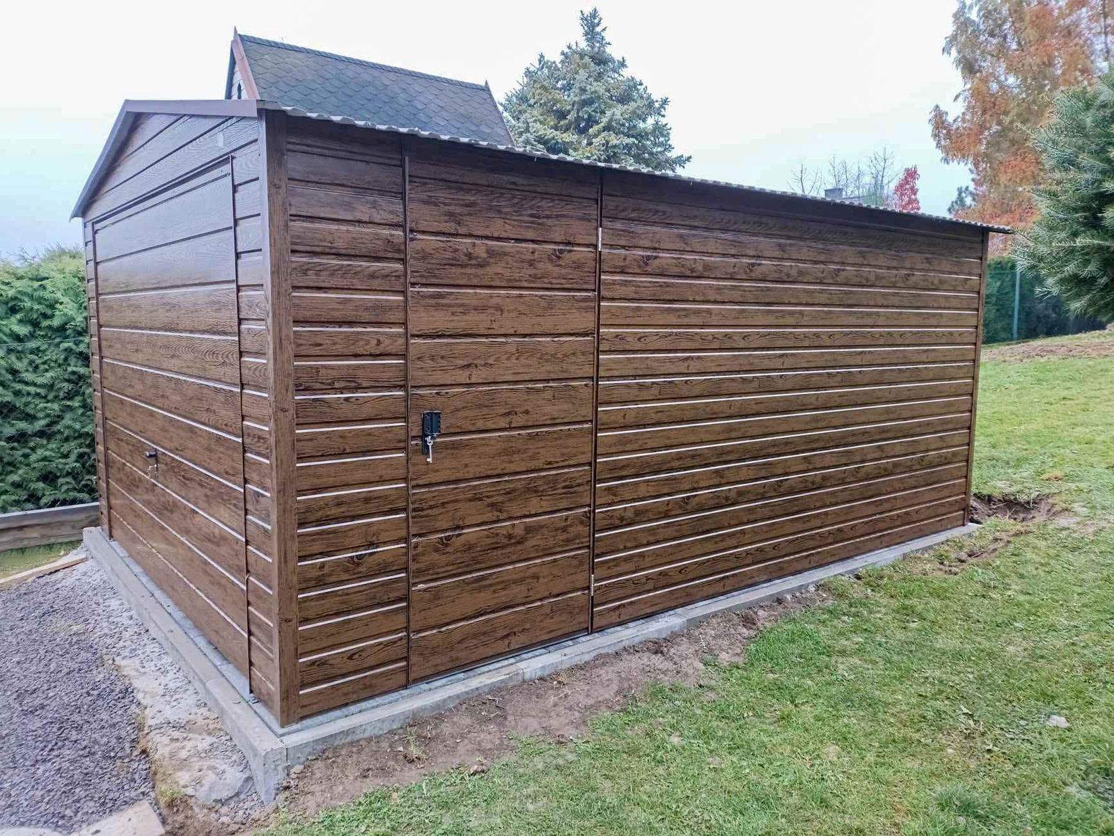 • szerokość: 4 m • długość: 6 m • dach: Dwuspadowy kolor Ciemny Brąz RAL8017 • Brama uchylna 300x200 cm przetłoczenie poziom T17 kolor ciemny orzech • drzwi 90x200 cm przetłoczenia T17 kolor ciemny orzech • Okno Uchylne PCV 80x60cm • Przetłoczenie ścian T7 poziom ciemny orzech • wysokość ściany : 213 cm • wysokość szczytu : 250 cm • Wysokość światła wjazdu 190 cm • Konstrukcja - profil zamknięty ocynk • Zamek + Klucze • nity + wkręty w kolorze garażu • obróbki ścian ciemny orzech • obróbki dachu Ciemny Brąz RAL8017