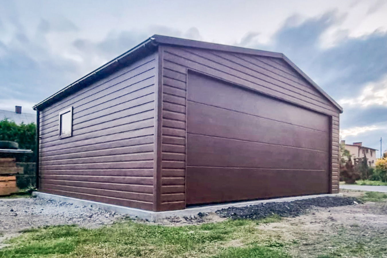 • szerokość: 6 m • długość: 5 m • dach: Dwuspadowy kolor Ciemny Grafit Antracyt RAL 7016 • Brama segmentowa 500x200 cm przetłoczenie poziom T17 kolor ciemny orzech • drzwi 90x200 cm przetłoczenia T17 kolor Ciemny Grafit Antracyt RAL 7016 • 2x Okno Uchylne PCV 80x60cm • Przetłoczenie ścian T7 poziom ciemny orzech • wysokość ściany : 243 cm • wysokość szczytu : 310 cm • Wysokość światła wjazdu 200 cm • Konstrukcja - profil zamknięty ocynk • Zamek + Klucze • nity + wkręty w kolorze garażu • obróbki ścian ciemny orzech • obróbki dachu Ciemny Brąz RAL8017 • Rynny + spusty