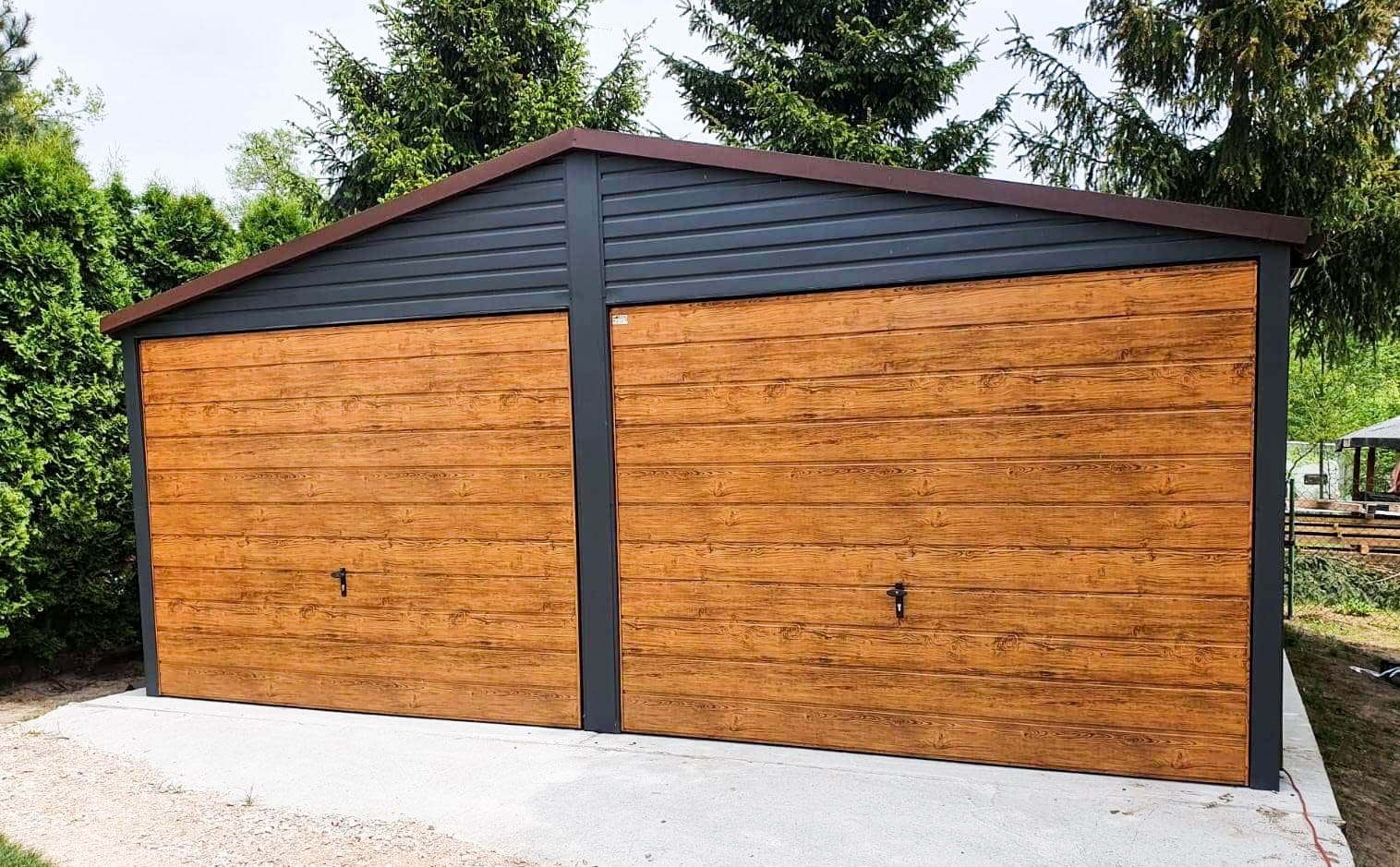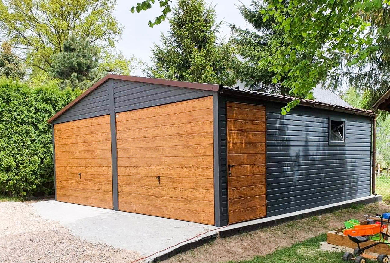 szerokość: 6m długość: 5,5m dach: dwuspad + blachodachwka brama: uchylna T17 jasny orzech Przetłoczenie ścian T8 poziom ciemny grafit - antracyt mat BTX 7016 dodatkowe drzwi 90 T17 jasny orzech okno PCV uchylne (grafit) wysokość ścian tył: 213 cm. wysokość ścian przód: 213 cm. wysokość wjazdu 195 cm wysokość w szczycie: 273 cm Ściany: Nowy mocniejszy trapez poziomy T8 „jasny orzech" Konstrukcja wzmocniona profilami zamkniętymi ocynkowanymi Dach: "ciemny grafit - antracyt mat BTX 7016" Zamki + Klucze nity + wkręty w kolorze garażu obróbki ścian jasny orzech obróbki dachu ciemny grafit - antracyt mat BTX 7016 rynny PCV + spusty